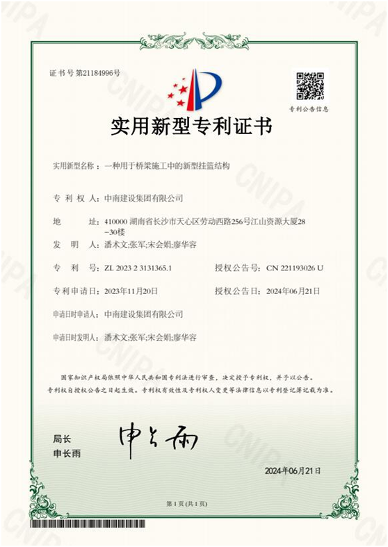 中南建设集团公司依托耒阳市大河边渡改桥工程项目建设,继4月获得国家知识产权局颁发的《一种应用于桥梁施工时裸露基岩上的钢板桩围堰结构》实用新型专利后,近日再获《一种用于桥梁施工中的新型挂篮结构》实用新型专利。该项目是湖南省重点旅游公路项目之一,自开工以来,公司高度重视,集中优秀人才和资源,攻克施工难题,加强技术攻关,推动科技成果加速转化,形成新质生产力。两项成果的获得,既增强了公司在路桥领域的建设实力,提振了信心,也为整个行业的科技进步贡献了中南智慧和力量。
