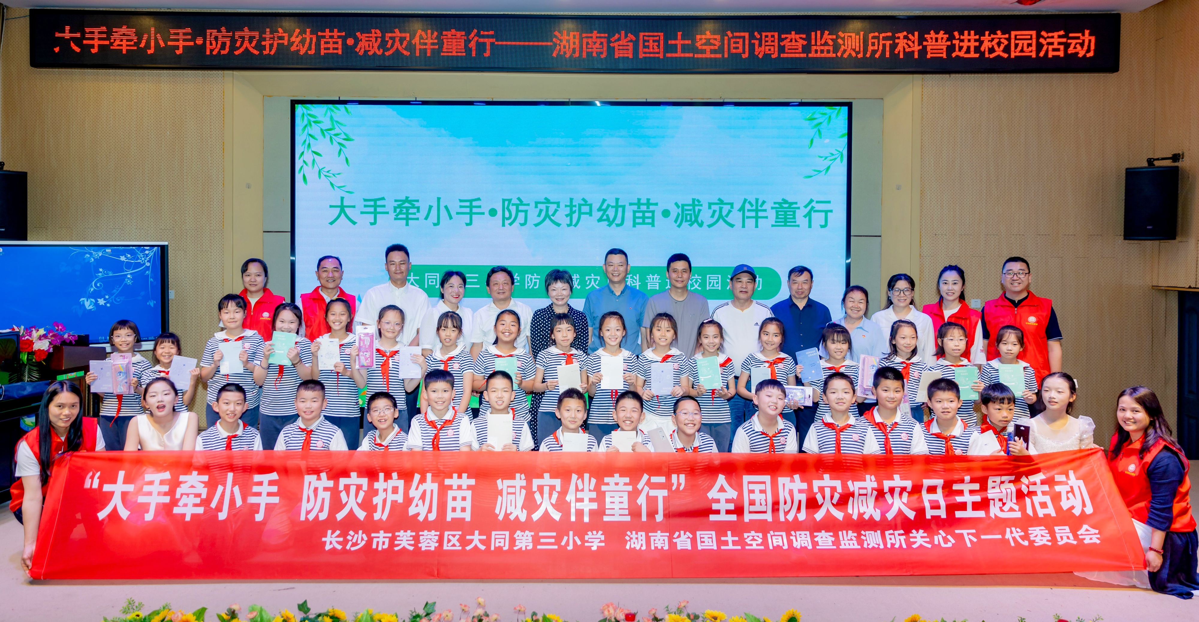 5月12日,正值全国第17个防灾减灾日,省空间所与长沙市芙蓉区大同第三小学携手,以“人人讲安全、个个会应急”为主题,共同举办“大手牵小手·防灾护幼苗·减灾伴童行”科普进校园活动。通过科普讲座、互动体验、实物展览等丰富形式,为师生们呈上一场寓教于乐的防灾减灾知识“盛宴”。省空间所副所长肖果其、大同三小校长陈薇、党支部书记文哲参加活动,近200余名师生共同参与。