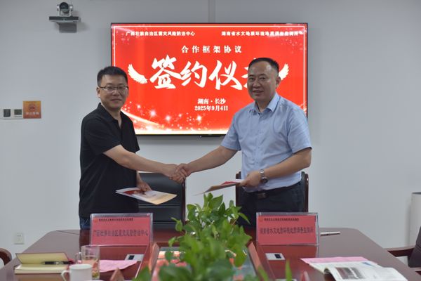 9月4日,湖南地质水环所与广西震灾风险防治中心(广西震防中心)正式签署战略合作协议。湖南所党委书记韩冰、广西中心副主任张忠利代表双方签约,刘定勇、李细光、吴教兵等共同见证。