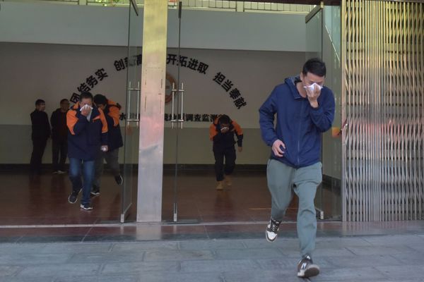 随着火警警报响起,应急疏散演练正式开始。办公楼内烟雾弥漫,参训人员立即进入应急状态,用湿毛巾捂住口鼻,弯腰低姿,沿预定疏散路线撤离至办公楼前坪。在教官的现场指导下,参训人员还进行了防毒面具佩戴、灭火器实操灭火以及消防水带连接使用等多项实战演练。