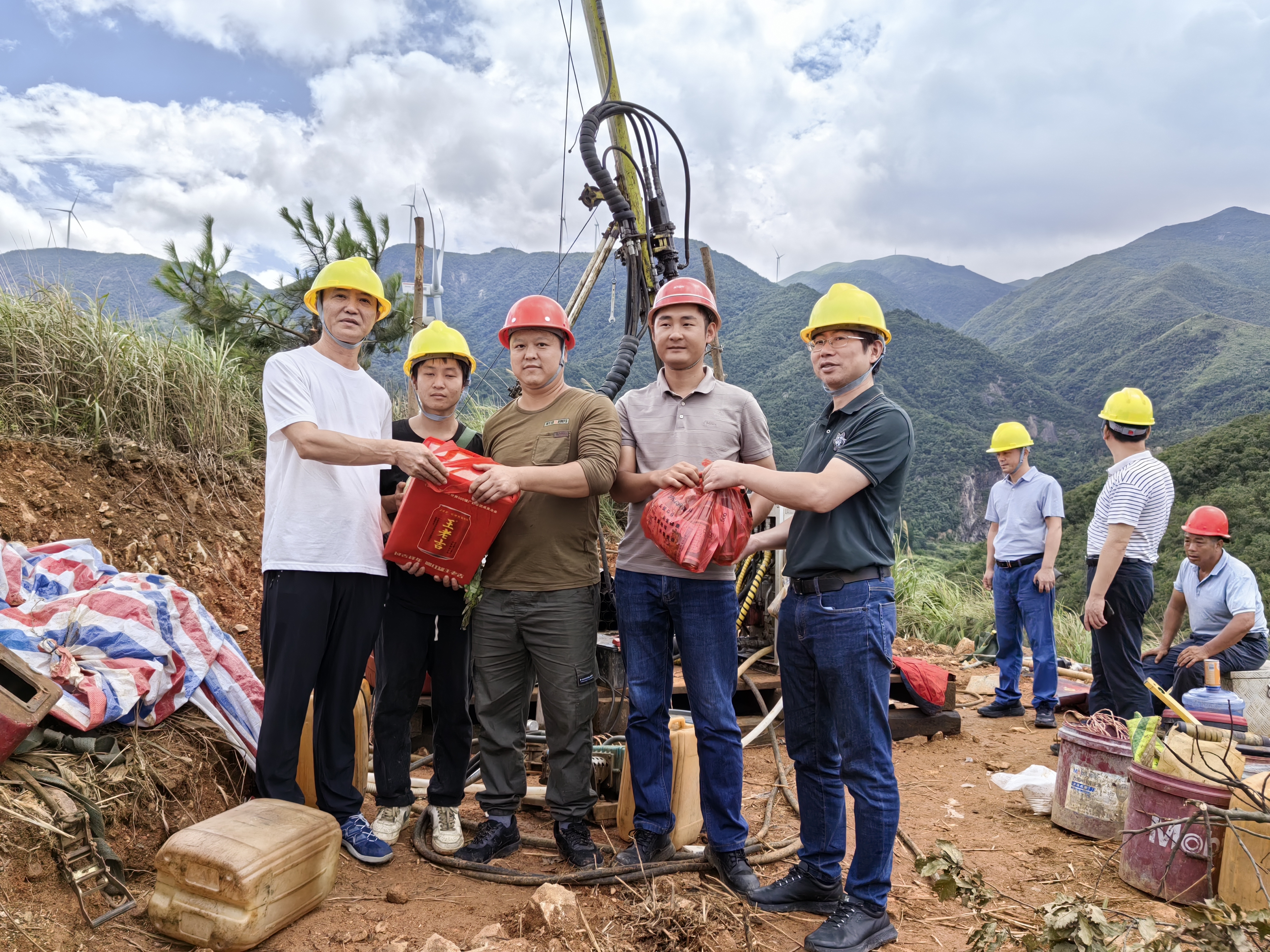 ▲8月1日,物化所副所长唐志高、工会主席王粒共到江华县大冲卡萤石矿普查项目部项目工地检查安全生产工作并“送清凉”。(文图/姜 峰