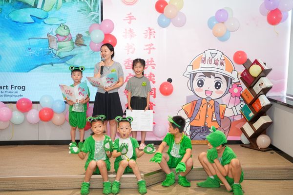 活动伊始,地质花蕾托管班的8名孩子以中英文情景演绎方式分享《聪明的青蛙》,可爱活泼的表现赢得满堂喝彩。随后,13组家庭开启跨越时空的文学之旅:从《夏洛的网》中感受纯真友谊,在《红岩》里体悟革命精神;于《你是人间的四月天》中品味诗意浪漫,借《如果历史是一群喵》进行创意解读……充分展现出两代地质人的人文素养。活动现场,孩子们攥着绘本的小手、妈妈们轻声讲解时微倾的身影,构成了一幅美好的亲子教育图景。