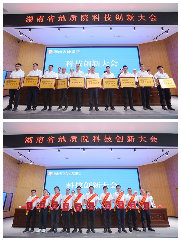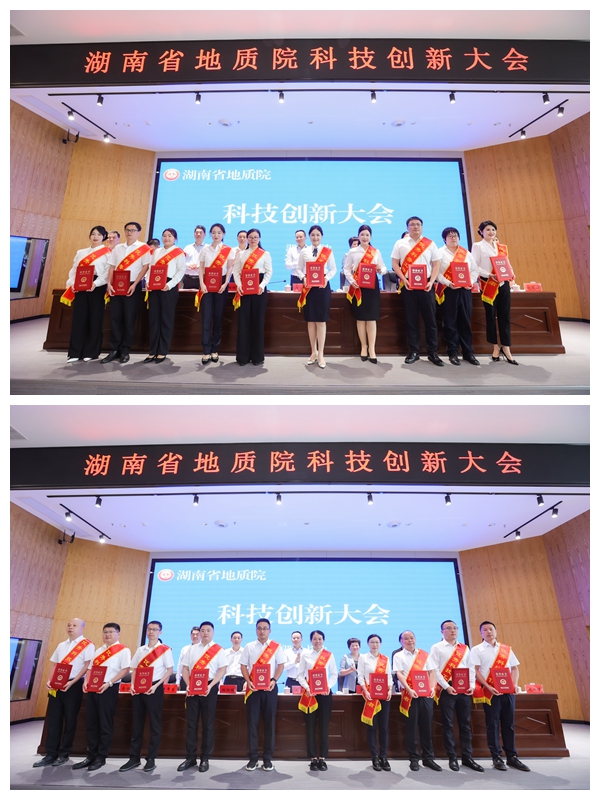 谈文胜代表院党委向获得奖励表彰的单位和职工表示热烈祝贺,向广大湖南地质科技工作者致以崇高敬意!他指出,湖南地质人的血脉里流淌着敢于创新、勇于创造的强大基因,科技创新始终是支撑和引领湖南地质工作发展的源泉和动力。他强调,要深刻领会科技创新的关键作用和核心地位,用科技创新的思想伟力指引发展方向、提升发展能级、破解发展难题、锻造发展动力。要正确认识地质科技的发展态势和问题短板,立足湖南区位优势、专业技术优势和地质产业优势,努力以科技创新支撑引领湖南地质新一轮跨越式发展。要精准发力科技赋能的全新动能和崭新局面,务必要在科创能级、地质新质生产力、提升科创能力、融入区域格局、凸显人才优势、构建科创生态上实现“六大突破”,重点实施好拓圈破层、平台赋能、人才强青、沃土厚植、双轮驱动、成果赋值、生态重构“七大工程”。他号召广大科技工作者积极投入新时代湖南地质新征程,加快建设创新型湖南地质,为奋力谱写中国式现代化湖南篇章做出更大的贡献。