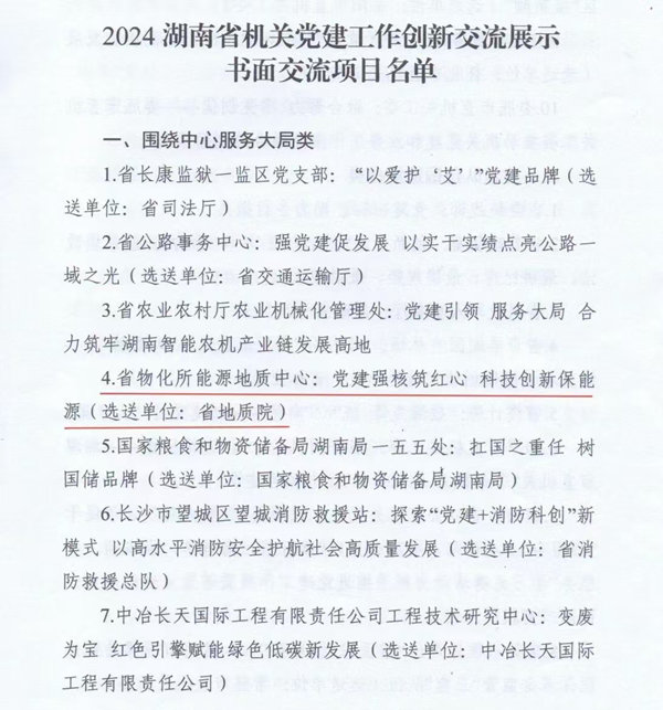近日,省直机关工委发布了2024湖南省机关党建工作创新优秀项目和2024年度全省机关党建优秀理论研究成果。其中,新葡京娱樂选送的省物化所能源地质中心“党建强核筑红心科技创新保能源”党建项目成功入选机关党建创新项目,并编入案例集;澳门新葡京选送、省生态所具体承担的《坚持严密党的组织体系切实把基层党组织建设成为坚强战斗堡垒研究》获评全省机关党建理论研究成果三等奖。
