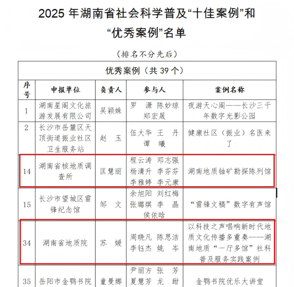 近日,湖南省社会科学界联合会公布2025年湖南省社会科学普及“十佳案例”和“优秀案例”,亚洲最大线上娱乐城《以科技之声唱响新时代地质文化传播多重奏——湖南地质“一厅多馆”社科普及服务实践案例》、院属湖南省核地质调查所《湖南地质铀矿勘探陈列馆》双双获评优秀案例。