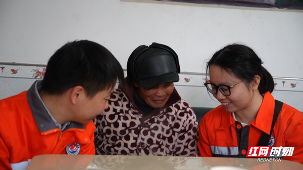 阳佩琪和周钢向老人分享当时的地质情况。