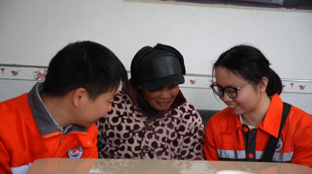 (阳佩琪和周钢向老人分享当时的地质情况。图源常宁市融媒体中心)