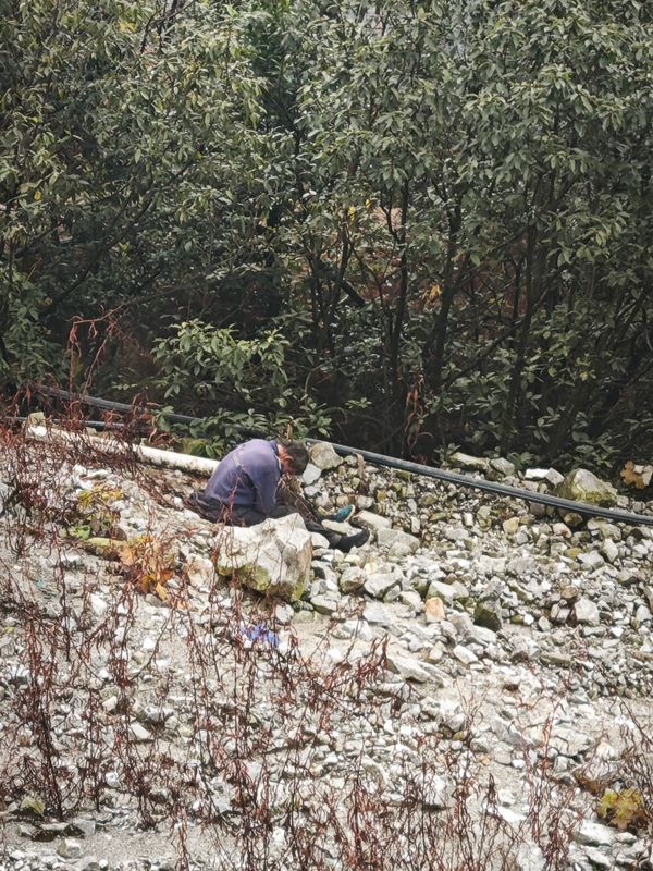 他们背起装备,转身奔向异常点位。山路崎岖,待1个小时到达点位后,只见一位老人低头坐着,身体蜷缩僵硬,只能发出微弱的声音。