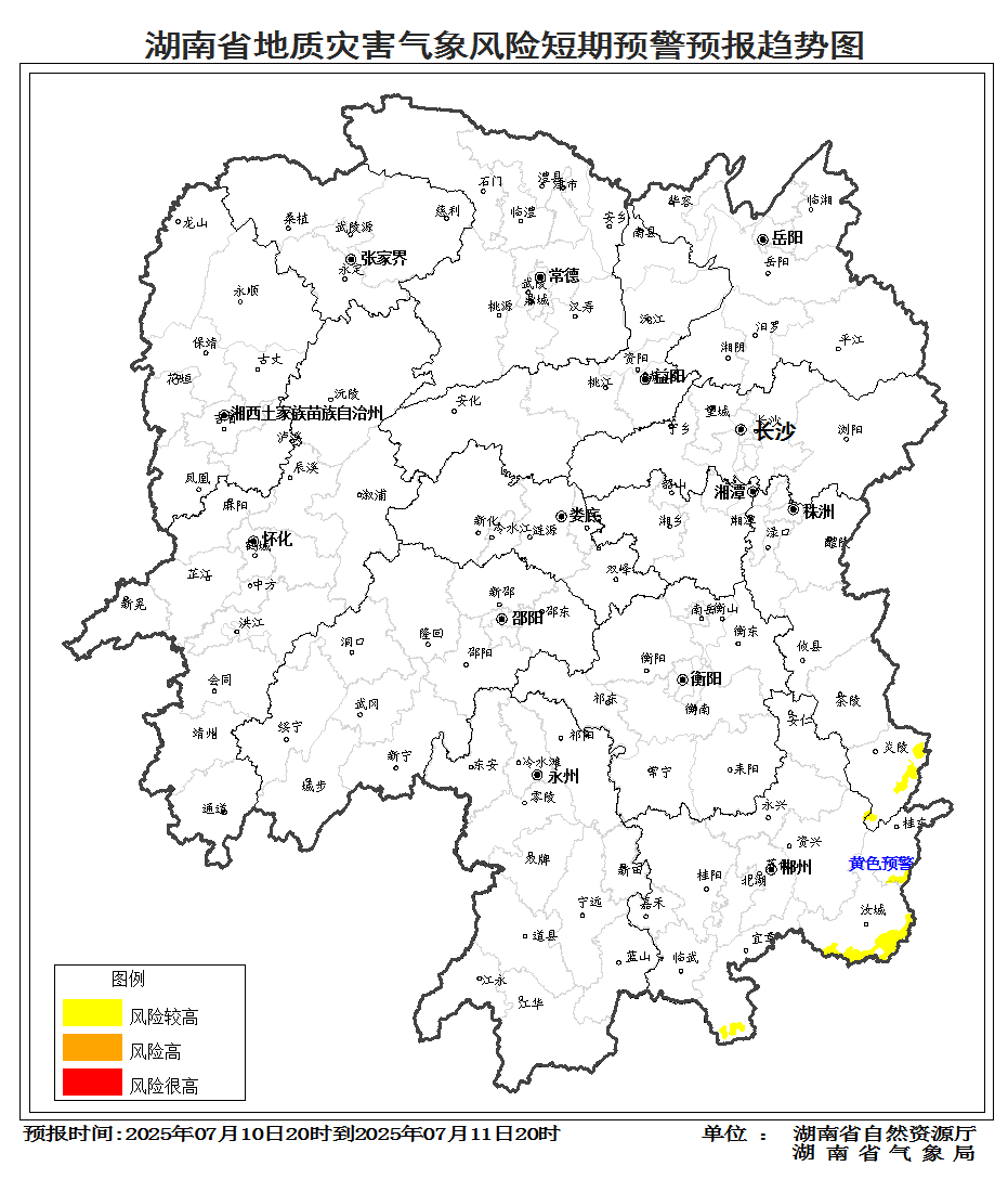 根据地质灾害成灾规律和孕灾条件,结合2025年7月10日 短期气象预报情况,省自然资源厅与省气象局联合会商得出如下结论:自7月10日20:00至11日20:00,受降雨影响, 湘东南的株洲、郴州等市州山地丘陵区发生突发性地质灾害风险较高黄色预警。