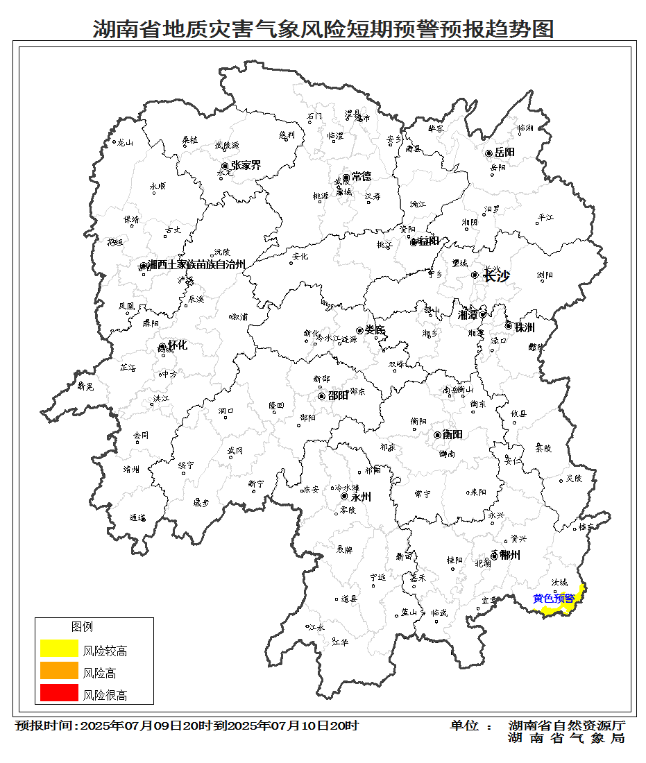 根据地质灾害成灾规律和孕灾条件,结合2025年7月9日短期气象预报情况,省自然资源厅与省气象局联合会商得出如下结论:自7月9日20:00至10日20:00,受台风影响,湘东南的郴州市山地丘陵区发生突发性地质灾害风险较高黄色预警。