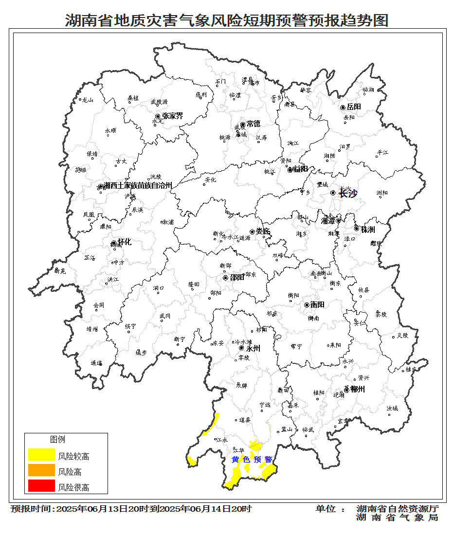 根据地质灾害成灾规律和孕灾条件,结合2025年6月13日 短期气象预报情况,省自然资源厅与省气象局联合会商得出如下结论:自6月13日20:00至14日20:00,受降雨影响, 湘南的永州部分山地丘陵区发生突发性地质灾害风险较高黄色预警。