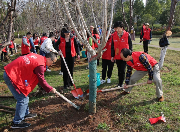 在圭塘河岸和+共享图书馆旁的植树基地前,各成员单位和学校师生以支部为单位进行植树活动。大家分工合作、配合默契,现场一片热火朝天的劳动景象,每一棵所植的树上都挂上了党建联盟单位的铭牌和绿色心愿卡,每一张心愿卡都承载了各单位成员以及孩子们对共筑和谐绿色家园的真挚祝愿。