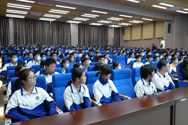 “向地球深部进军是我们必须解决的战略科技问题”“我们日常每天接触的矿产资源可达四五十种之多”“大家知道我国为何要高价进口铁矿石吗”……上达国际形势、国家战略,下接身边环境、生活日常的精彩讲解,深深吸引着同学们好奇和求知的目光。讲座最后,谈文胜以北大博雅塔、三人乘电梯、一块石头等3个故事,启发同学们要锚定自己的初始值,重视所处平台的作用,找准自身定位,实现独特的人生价值;勉励大家以国家富强、人民幸福为己任,练就过硬本领,积蓄前进力量,投身强国伟业,以青春之我、奋斗之我,在三湘大地上奋力谱写“红心向党、学以报国,请党放心、强国有我”的青春华章。