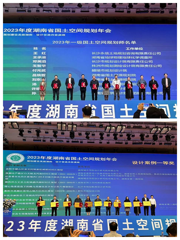 在院党委行政的高度重视和精心统筹下,院属单位积极参与本次年会的各奖项评比,并取得优秀成绩。其中,空间所编制的《湘西州古丈县古阳镇栖凤湖村村庄规划(2021-2035年)》和地信所编制的《衡阳市国土空间生态修复规划(2021-2035年)》荣获一等奖(全省共33个),地调所编制的《东安县国土空间总体规划》获二等奖,城调所编制的《益阳市资阳区长春镇先锋桥村村庄规划》荣获三等奖;物化所的王承浚、空间所的汤静两位同志荣获2023年湖南省“一级国土空间规划师”称号(全省共20人);空间所6篇论文荣获优秀国土空间论文奖,其中二等奖3篇,三等奖1篇,优胜奖2篇。
