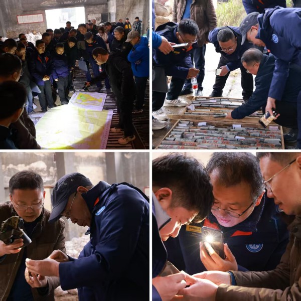 当日上午,考察团在香花岭矿区先后参观了锂矿、锡矿岩芯库,并实地考察了矿区主干断裂 F1、“矿物熊猫 —— 香花石” 产地,以及泥盆系石灰岩与花岗岩接触带的含铍条纹岩等典型地质现象。在考察过程中,省矿调所技术人员详细介绍并讲解了香花岭矿区的地质特征与矿床特征。期间,双方围绕区内锡矿床和锂矿床的产出特征、矿石特征及成矿机制等专业问题,展开了深入探讨与交流。