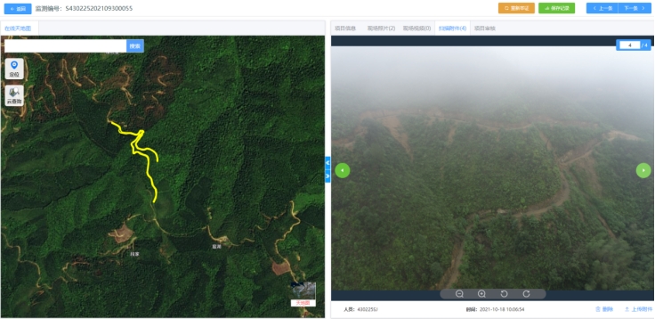 不管图斑核查难易都要认真对待。一般来说,位于城区的图斑交通道路明显,较易到达现场进行拍摄。而位于城郊的图斑往往“深藏不露”,通往图斑的小路被杂草覆盖,地图上也没有标注,一时难以被发现。对于难度大的核查任务,外业核查队员积极同县市区相关部门及本地村民沟通咨询,以“打破砂锅问到底”的决心,想方设法到达图斑现场,拍摄到准确、真实的照片。对于人力确实难以到达的图斑,外业核查人员则通过精准操作无人机拍摄到举证影像。另外还有一些位于炎陵县、茶陵县深山中的图斑,即便使用了无人机进行拍摄,也会因驾驶员与无人机之间的感应距离不能太远,导致无人机不能接近深山图斑;遇到雨水天气雾气较重,无人机拍摄照片不清,无法反映实地情况,则需圈出重点,待天气晴好后另行补测。