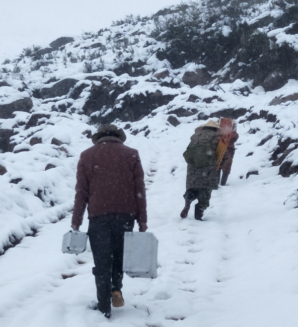单是行车已险象环生,更糟糕的是,多数情况下测井车开不上山,只能靠肩拉手扛将测井设备抬上山。在这种高海拔缺氧地区,空手爬山都不是易事,何况还要带着几百斤的设备爬到山顶,更关键还是自己开路!印象最深的是在郭达山隧道测井,车子只能开到半山腰海拔3500米的地方,而钻机在3800米的山上,项目组几个人硬是背着散件设备,再请了几个人帮忙抬着几百斤的大设备,一步一步捱了两个多小时才爬上山。高远说:“看着很近的一段路,经常要走一两个小时才能到,要是遇到雨雪天气,那就更麻烦了,总感觉看到了钻机,可是又还没到,那种又累又绝望的心情真是难以描述。”