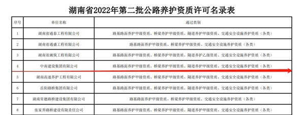 近日,湖南省交通运输厅网站发布《关于公布2022年第二批公路养护作业单位资质许可决定的公告》,中南建设集团有限公司荣获公路养护全序列甲级资质。公路养护资质是全国统一资质证书,中建公司此次荣获的四项甲级资质,包含路基路面养护甲级资质、桥梁养护甲级资质、隧道养护甲级资质、交通安全设施养护资质(各类),是国内公路养护资质的最高等级。