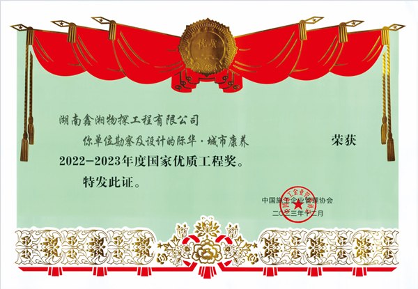 近日,中国施工企业管理协会公布2022-2023年度国家优质工程奖获奖名单,遥感所鑫湘物探公司承担的际华·城市康养详细勘察项目工程名列其中,喜获该项殊荣。