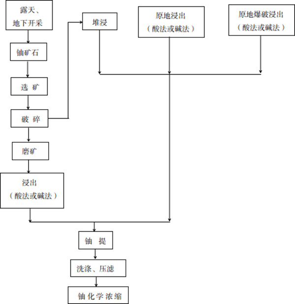 流程:选矿(放射性预选)、矿石破碎、磨矿、浸出(酸法或碱法)、离子交换、淋洗、萃取、反萃取、沉淀、过滤、干燥(铀化学浓缩物)。