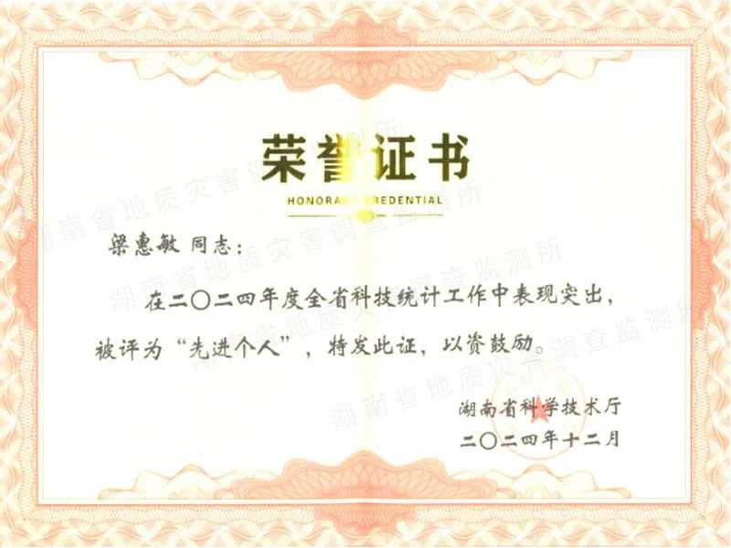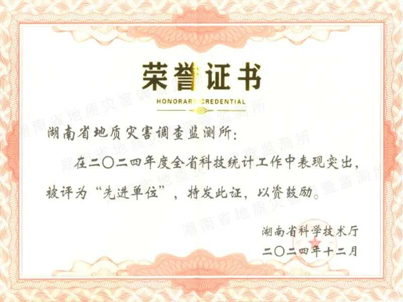 2024年12月27日,湖南省科学技术厅召开全省科技统计工作会议,通报表彰2024年度全省科技统计工作中成绩突出的25家先进单位、51名先进个人。省地质灾害调查监测所获“2024年度湖南省科技统计工作先进单位”,职工梁惠敏同志获“2024年度湖南省科技统计工作先进个人”,是澳门新葡京系统内唯一获此殊荣的单位和个人。