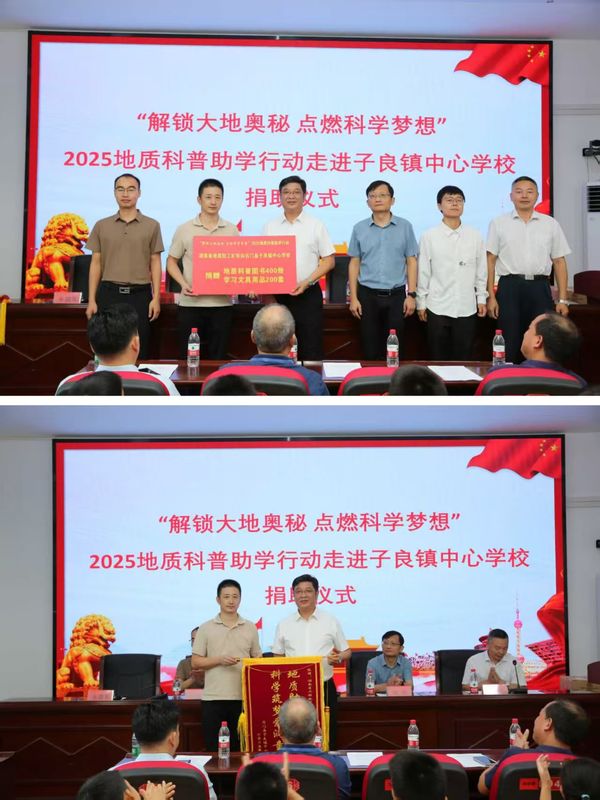在新葡京娱樂关工委、团委、妇联的共同指导下,澳门新葡京工矿所党委书记、副所长张铁红带队,党委副书记肖宏文、副所长黄超刚等一行来到校园,不仅送来了地质科普图书、学习文具和一批矿物教学标本,更带来了一整套“量身定制”的课程设计。学校回赠锦旗时,张铁红表示:“这面旗是荣誉,更是责任。我们始终坚守资源勘探与防灾减灾的主责主业,也积极履行社会责任,把专业的科学知识用孩子们听得懂的方式送进课堂。”