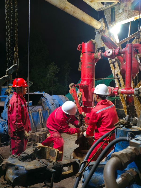 自8月18日项目恢复施工以来,面对复杂的地下地质条件和易漏地层带来的技术挑战,项目团队精准研判形势,创新采用“顶漏钻进”施工工艺与“穿鞋戴帽”固井方法,构建了“效率-质量-成本”协同优化方案。该方案在确保导管段固井质量的同时,显著提升了钻井效率。团队成员全程驻守现场,通过精细化调控钻井参数,成功实现孔内“边漏边钻”的动态平衡,有效避免了因反复堵漏造成的工期延误和材料损耗。
