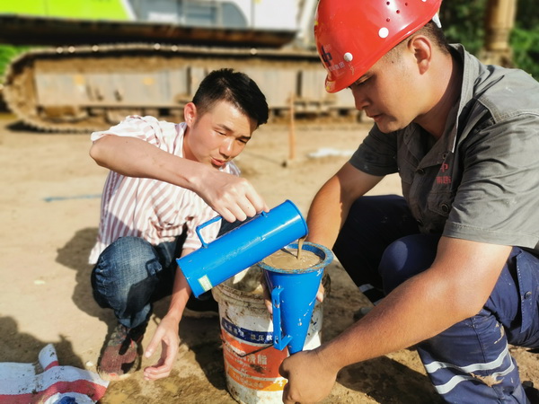 据悉,该队于今年6月正式立项该科研项目,旨在以华容梅田湖大桥桩基施工为依托,重点研究旋挖钻机在典型复杂地层条件下的成桩技术,为类似工程提供经验借鉴。经过前期紧张准备,项目于6月28日正式开工,6月30日进入钻进阶段。项目实施期间,项目组成员始终坚守在施工现场,指导施工并获取第一手资料;同时围绕钻孔泥浆护壁问题以及泥浆配比、比重、含砂率、粘度,钻机钻压、转速等参数进行不断量测和改进。中南大学地质工程系主任孙平贺到现场查看项目情况时,还针对旋挖钻机在超深大直径复杂地层的地质状况,就泥浆配比如何操作等问题提出了建设性意见。由于华容梅田湖地区正处汛期,为防止钻孔事故的发生,科研项目组成员和现场施工人员加班加点、通力合作,仅用了5天即顺利完成全部钻进工作。