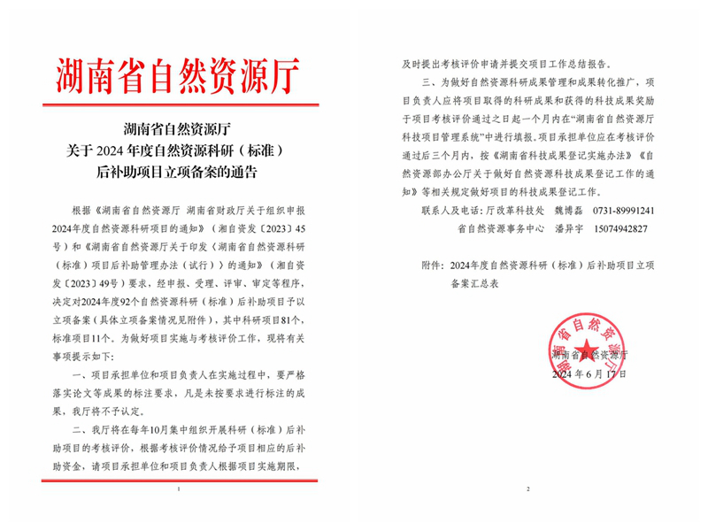 省空间所成功立项备案3项湖南省自然资源厅2024年度自然资源科研(标准)后补助项目