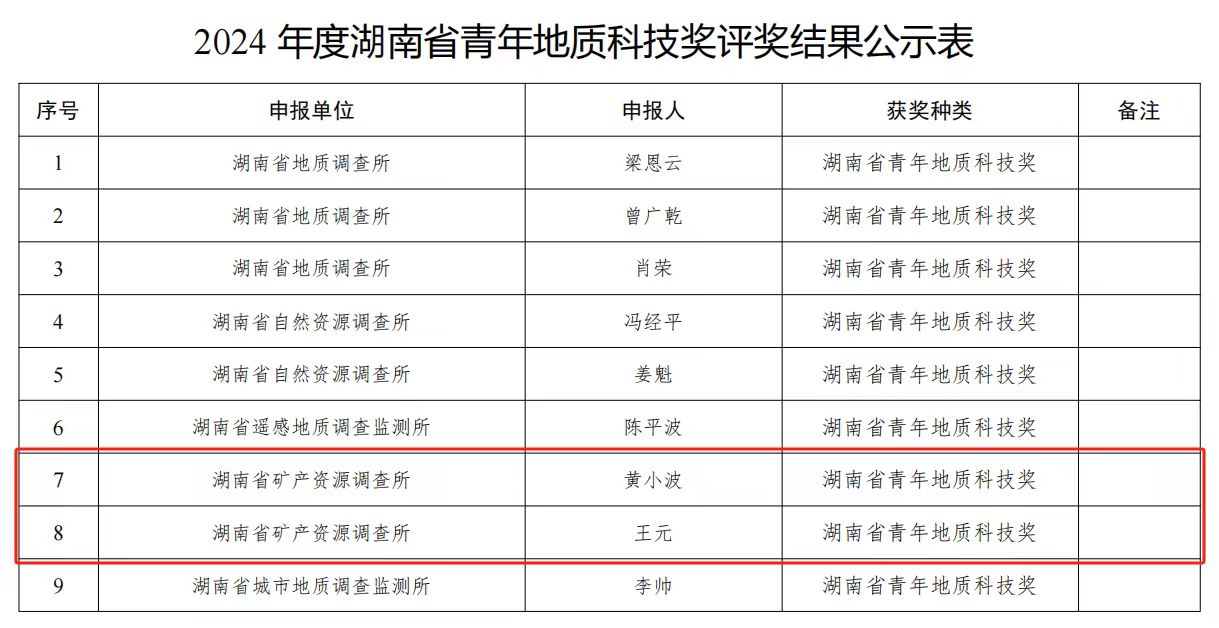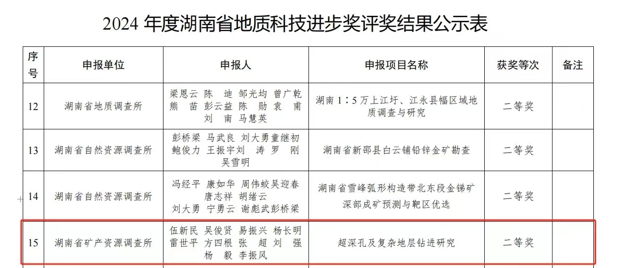 11月1日,湖南省地质学会公布了2024年度湖南省地质科技奖评选结果,省矿调所喜获佳绩,《超深孔及复杂地层钻进研究》获得“2024年度湖南省地质科技进步奖”二等奖,黄小波、王元两位同志均获得“2024年度湖南省青年地质科技奖”。