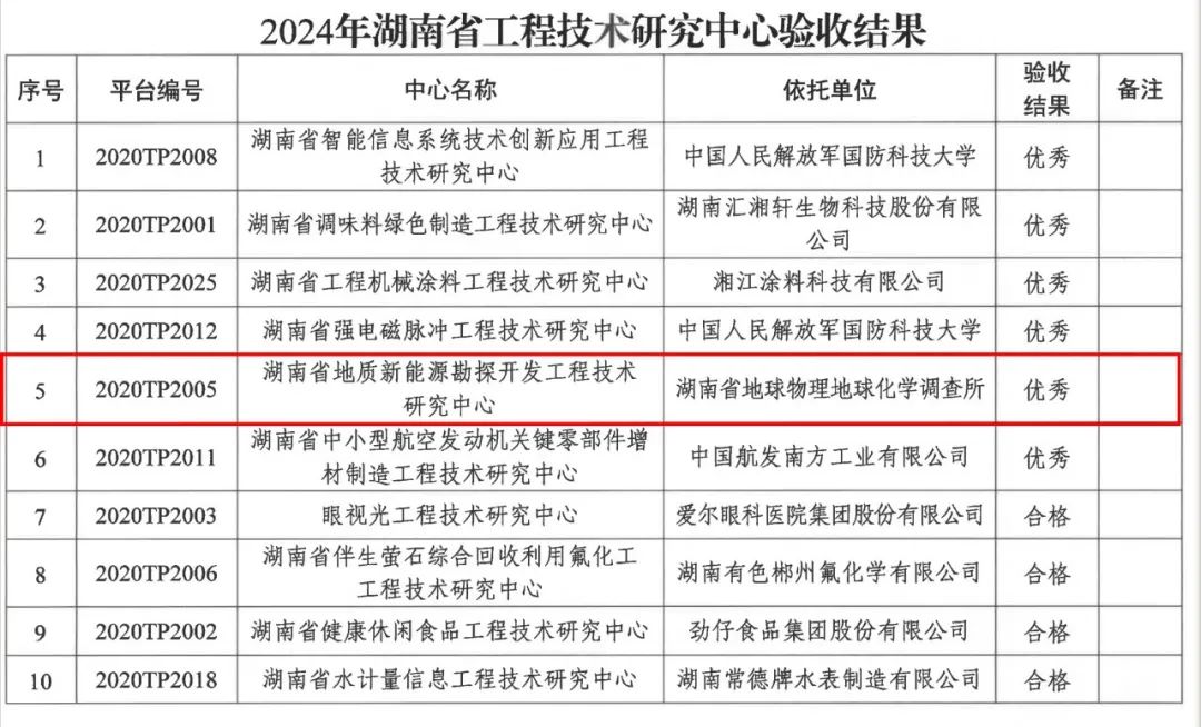 近日,湖南省科学技术厅公布了2024年湖南省工程技术研究中心验收结果,由省物化所承建的“湖南省地质新能源勘探开发工程技术研究中心”凭借卓越的科研实力与创新成果,在众多参评单位中脱颖而出,荣获“优秀”等级。这一殊荣不仅是对中心科研能力与技术创新的高度认可,更标志着该中心在地质新能源勘探开发领域取得了重要的里程碑式跨越,为后续发展奠定了坚实基础。