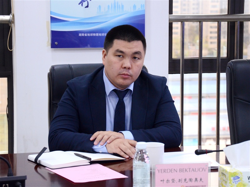 叶尔坚·别克陶奥夫代表萨特巴耶夫地科院介绍了该院概况、业务与国际合作成果。他对物化所在亿吨级锰矿勘探、富硒产业研发及健康地质研究方面取得的成果表示赞赏,充分肯定了物化所在中国地质勘探领域的领先地位。他指出,依托中哈两国深厚的友好合作基础、三方显著的互补优势以及跨境成矿带研究的良好前景,萨特巴耶夫地科院对开展合作充满信心,并就此提出三点合作建议:一是联合开展地质勘探、智慧矿山建设、AI与地球物理化学方法融合等领域技术攻关;二是共享成矿规律研究成果,开展中哈跨境成矿带对比研究;三是针对哈萨克斯坦潜力矿产区块,整合三方优势资源,共同推动项目落地。