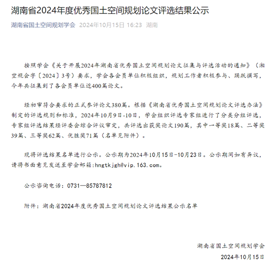 省城调所喜获湖南省2024年度优秀国土空间规划论文一等奖