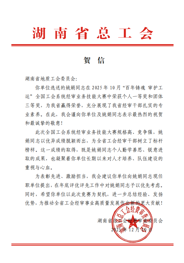 近日,湖南省总工会发来贺信,对新葡京娱樂城调所姚娟同志在全国总工会主办的“百年铸魂・审护工运”全国工会系统经审业务技能大赛中荣获个人一等奖和团体三等奖,为湖南省赢得荣誉,向湖南省地质工会、新葡京娱樂城调所以及姚娟同志致以最热烈祝贺和最诚挚感谢。