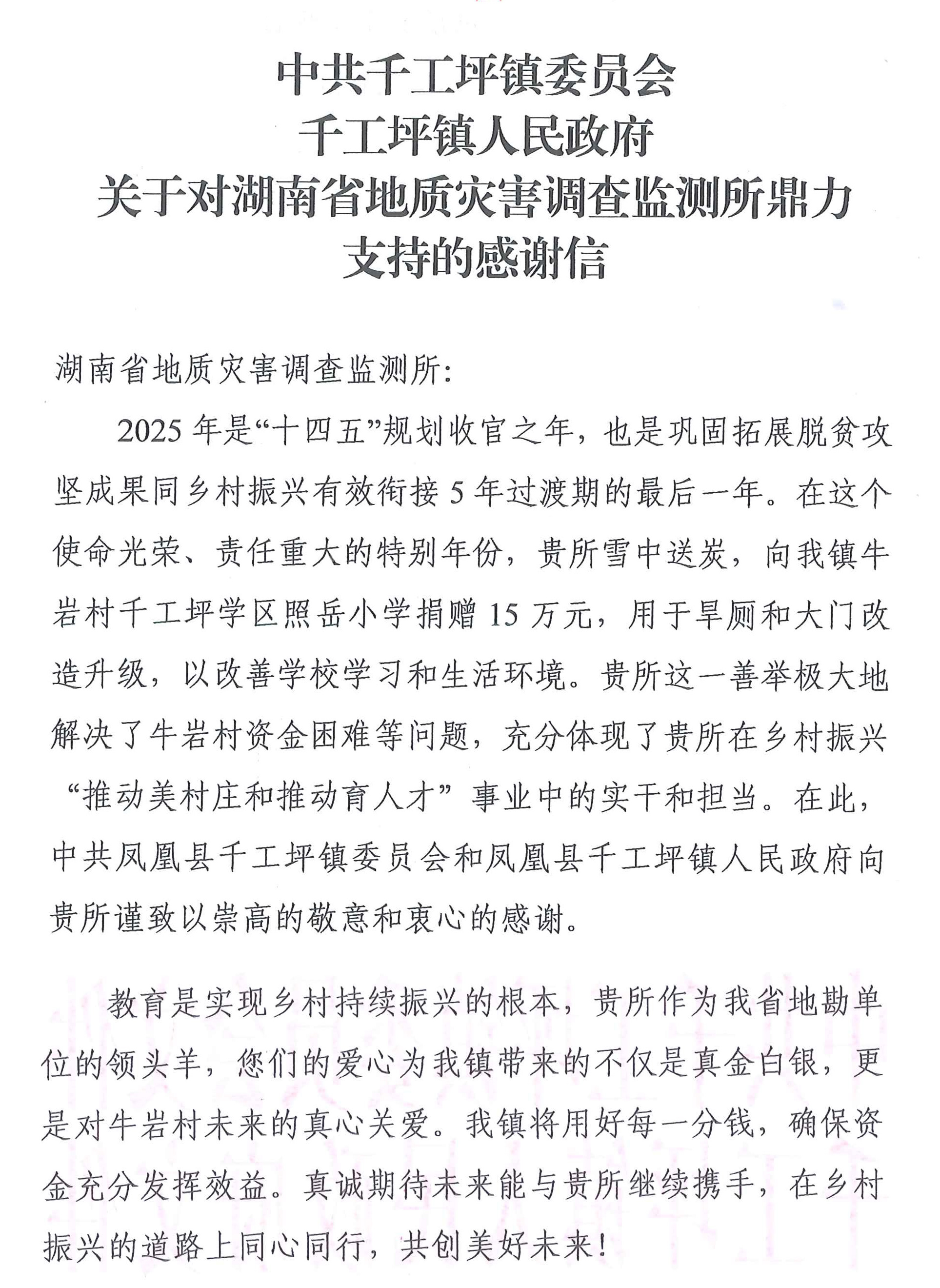 7月27日,澳门新葡京地灾所收到中共凤凰县千工坪镇委员会和凤凰县千工坪镇人民政府写来的感谢信,感谢该所向凤凰县千工坪镇牛岩村照岳小学捐赠15万元专项改造资金,升级校园基础设施、优化师生学习生活环境,为该所助力乡村全面振兴的务实作为点赞。地灾所作为全国自然资源系统先进单位,始终坚守服务民生的初心,在从省自然资源... .....