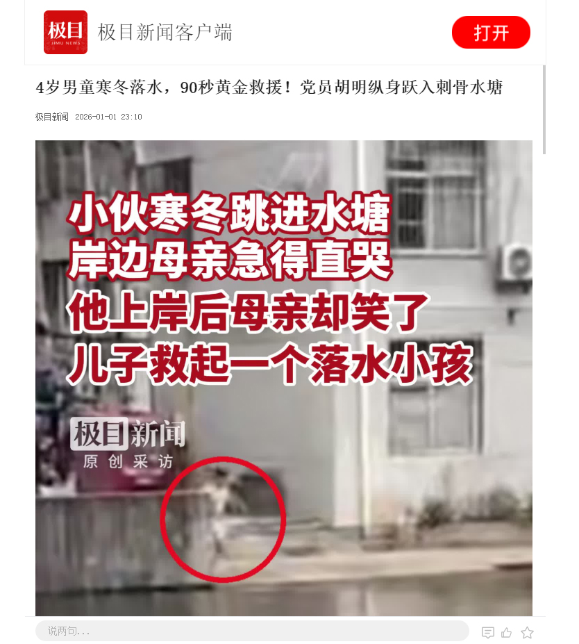 回忆起那惊心动魄的120秒,胡明笑着说,这其实只是一件“小事”。2025年12月31日,辞旧迎新的跨年夜氛围渐浓,一个三四岁的小女孩突然哭着跑过来说有人掉水塘里了。“我当时下意识就冲了过去了,脑袋里只有一个想法,就是救人!”他一边往前冲,一边甩掉身上的衣服,一头扎进水塘,迅速游至孩子身旁,一把抓住孩子脖颈处,将其头部托出水面,随后,奋力划水,拼尽全力向岸边游去。从听到呼救到成功将孩子救上岸,整个过程不超过两分钟。这宝贵的“黄金两分钟”,不仅挽救了一个幼童的生命,更守护了一个家庭的幸福。