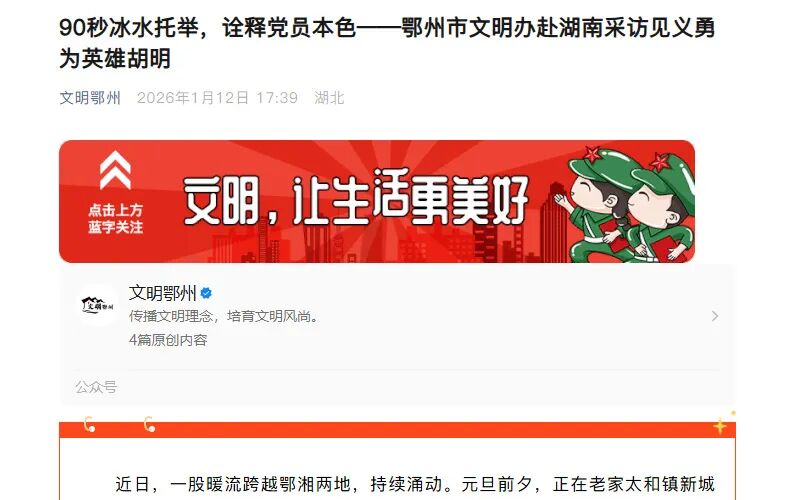 2026年1月12日 文明鄂州 《90秒冰水托举,诠释党员本色——鄂州市文明办赴湖南采访见义勇为英雄胡明》