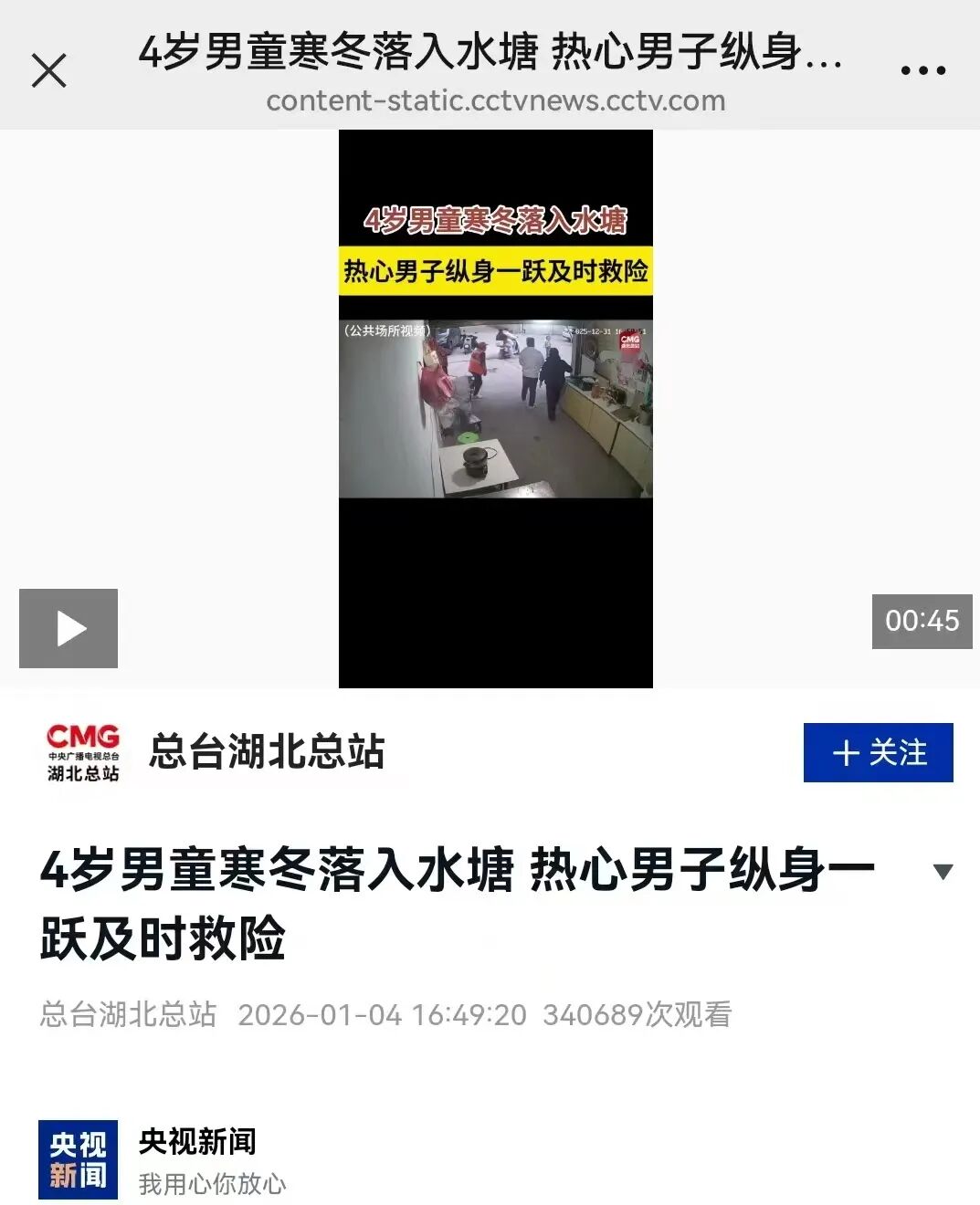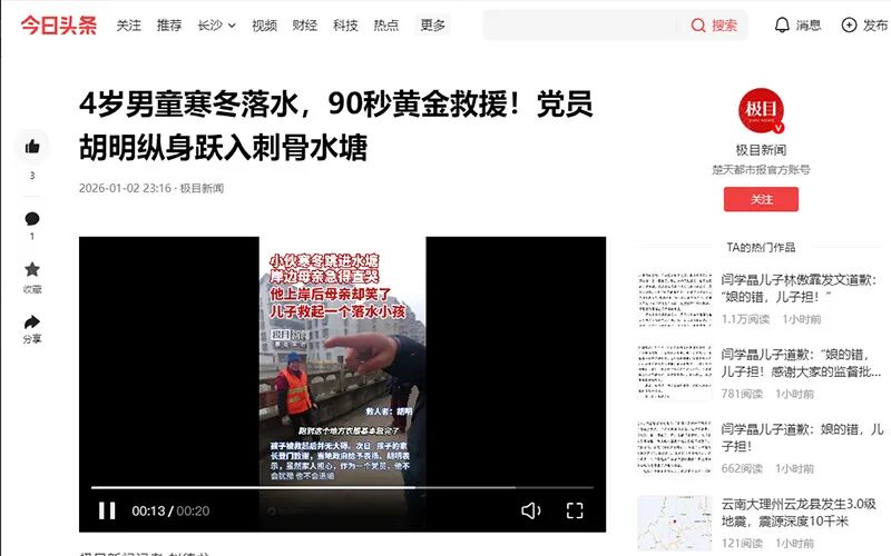2026年1月2日 今日头条《4岁男童寒冬落水,90秒黄金救援!党员胡明纵身跃入刺骨水塘》