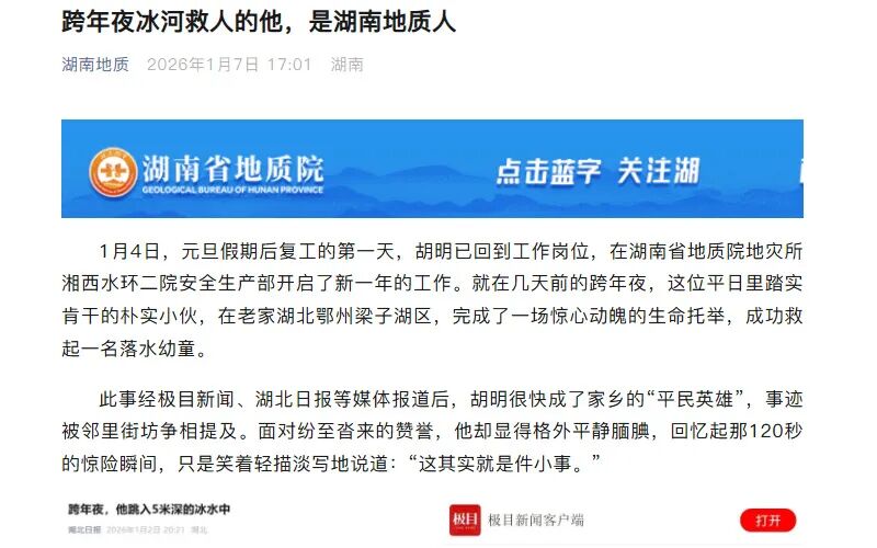 2026年1月6日 新湖南《冰河一跃显担当,湖南地质人胡明跨年夜勇救落水儿童》