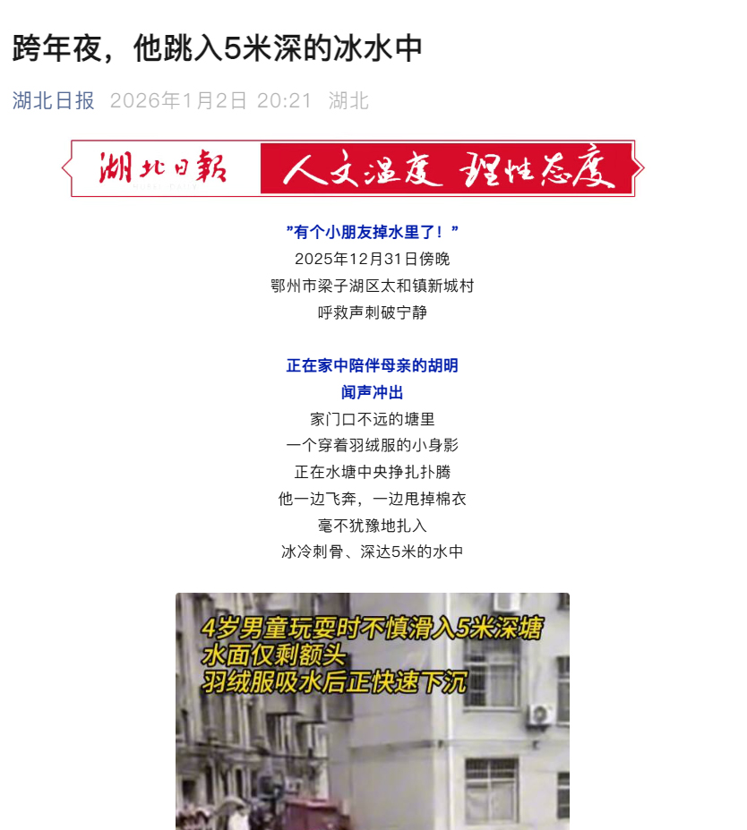 2026年1月4日,元旦假期后复工的第一天,胡明已经回到工作岗位,在亚洲最大线上娱乐城地灾所湘西水环二院安全生产部的岗位上开始了新一年的工作。而他最近做了一件“大事”——在老家湖北鄂州梁子湖区成功救出一名落水幼童。该事迹经极目新闻、湖北日报报道出来后,让他迅速成为远近闻名的“红人”,只要出门他都要收获一片赞赏。回忆起... .....