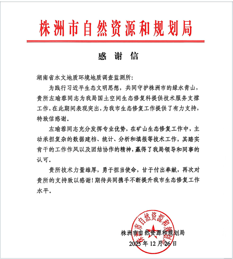 感谢信中提到,为践行习近平生态文明思想、守护株洲绿水青山,左瑜蓉同志在该局国土空间生态修复科的技术服务工作中表现突出:充分发挥专业优势,主动承担矿山生态修复相关的复杂数据建档、统计、分析与填报等工作,以踏实肯干的作风和团结协作的精神,赢得了该局领导与同事的一致认可。同时,株洲市自然资源和规划局在信中还称赞水环所“技术力量雄厚、勇于担当使命、甘于付出奉献”,期待双方继续携手,共同提升株洲市生态修复工作水平。
