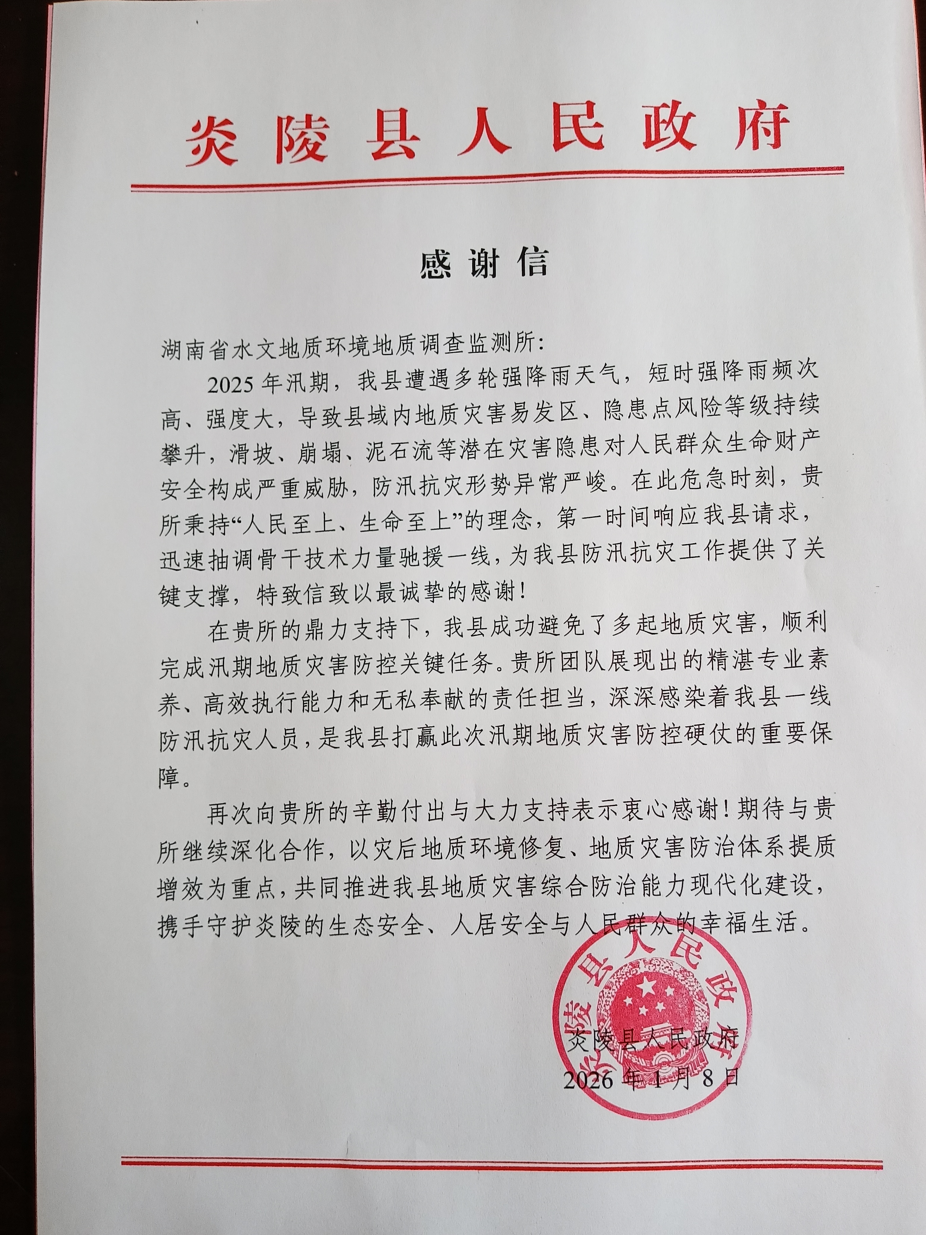 这封感谢信是对水环所技术实力与责任担当的肯定。下一步,水环所将继续发挥专业优势,深化与炎陵县的合作,助力当地筑牢地质安全防线,守护炎陵的生态安全与群众幸福生活。 (文字/刘婷丹 编辑/申卫卫)