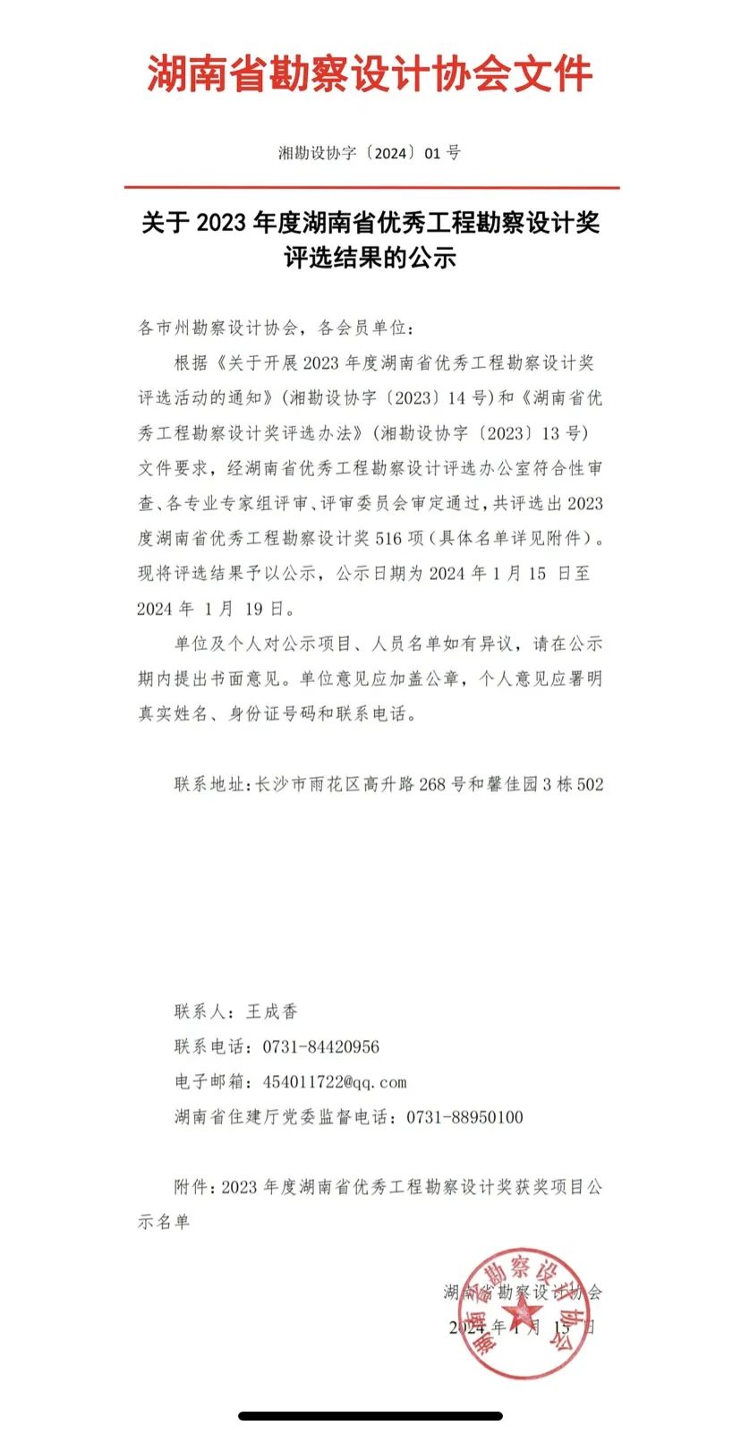 省城调所喜获2023年度湖南省优秀工程勘察设计奖