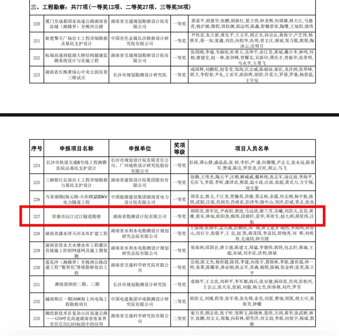 近日,湖南省勘察设计协会公布2023年度湖南省优秀工程勘察设计奖评选结果,由省城调所联合省地灾所湖南省勘测设计院有限公司共同实施的常德市沅江过江隧道勘察项目,获得工程勘察类一等奖。