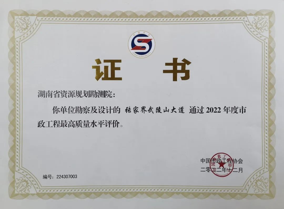近日,中国市政工程协会公布了2022年度中国市政工程最高质量水平评价工程获奖名单,其中,由城调所403队工勘院(原湖南省资源规划勘测院常德分院)与湖南省建工集团共同申报的张家界武陵山大道项目获得该奖项。 张家界武陵山大道是链接张家界市城区与武陵源核心景区的重要枢... .....