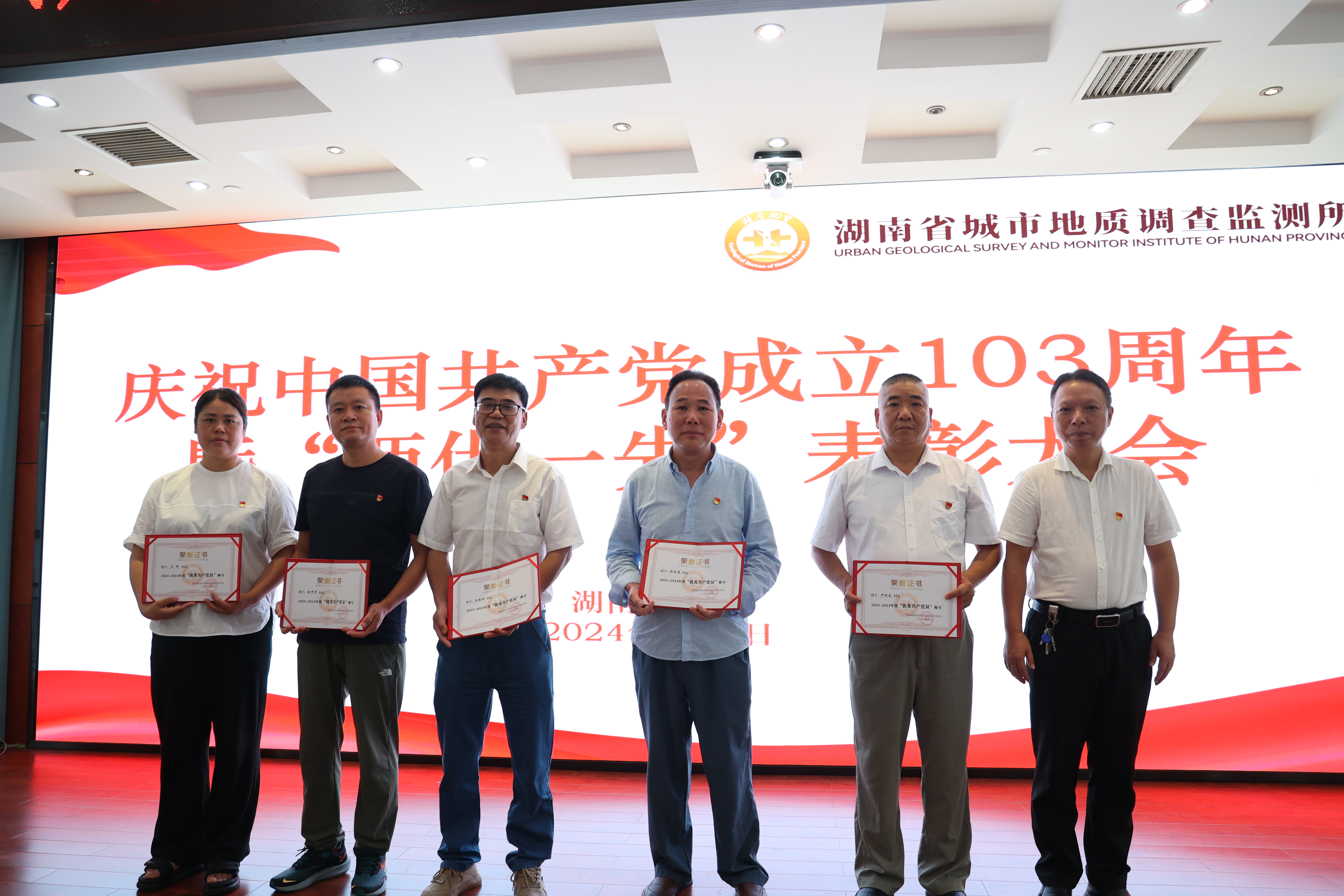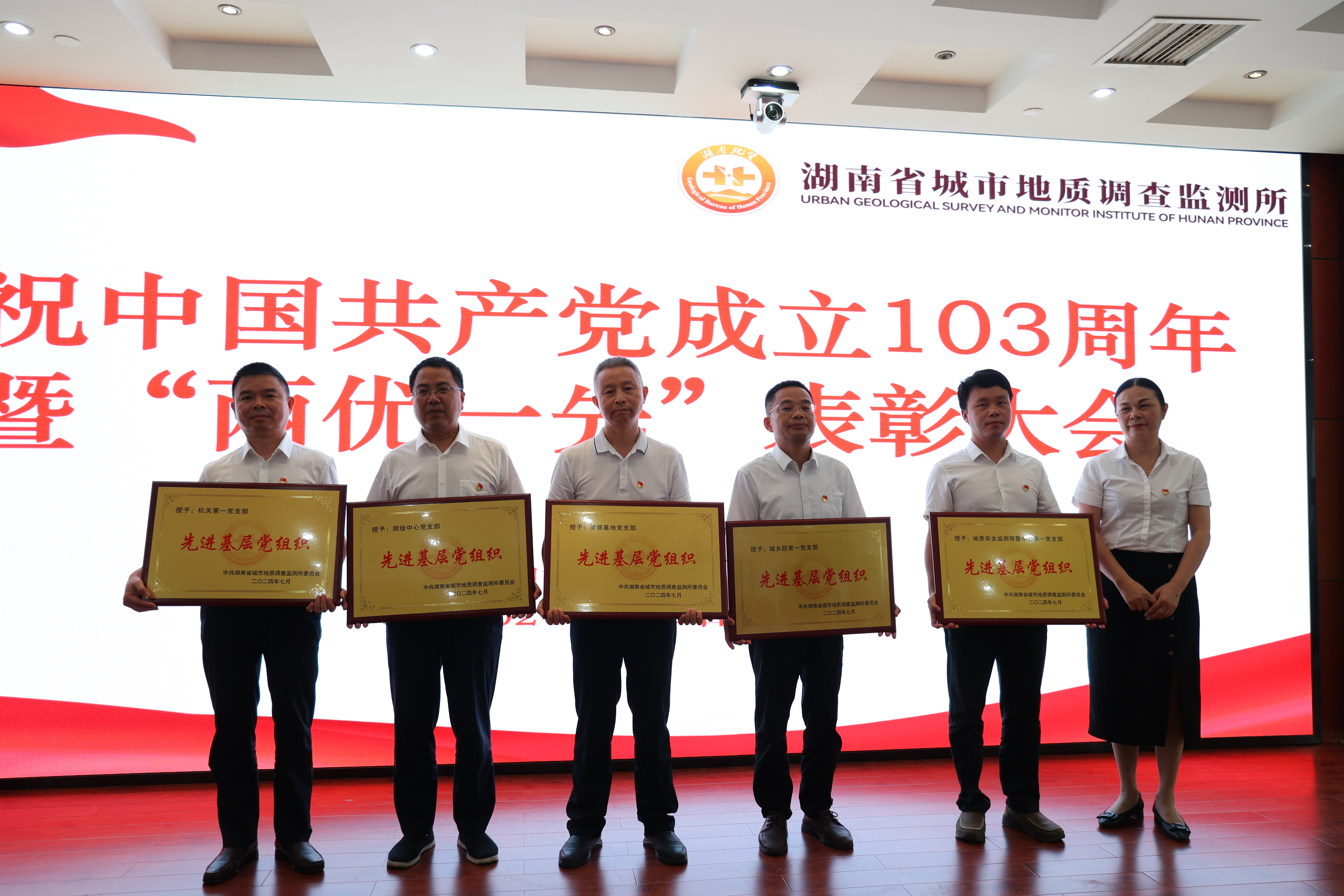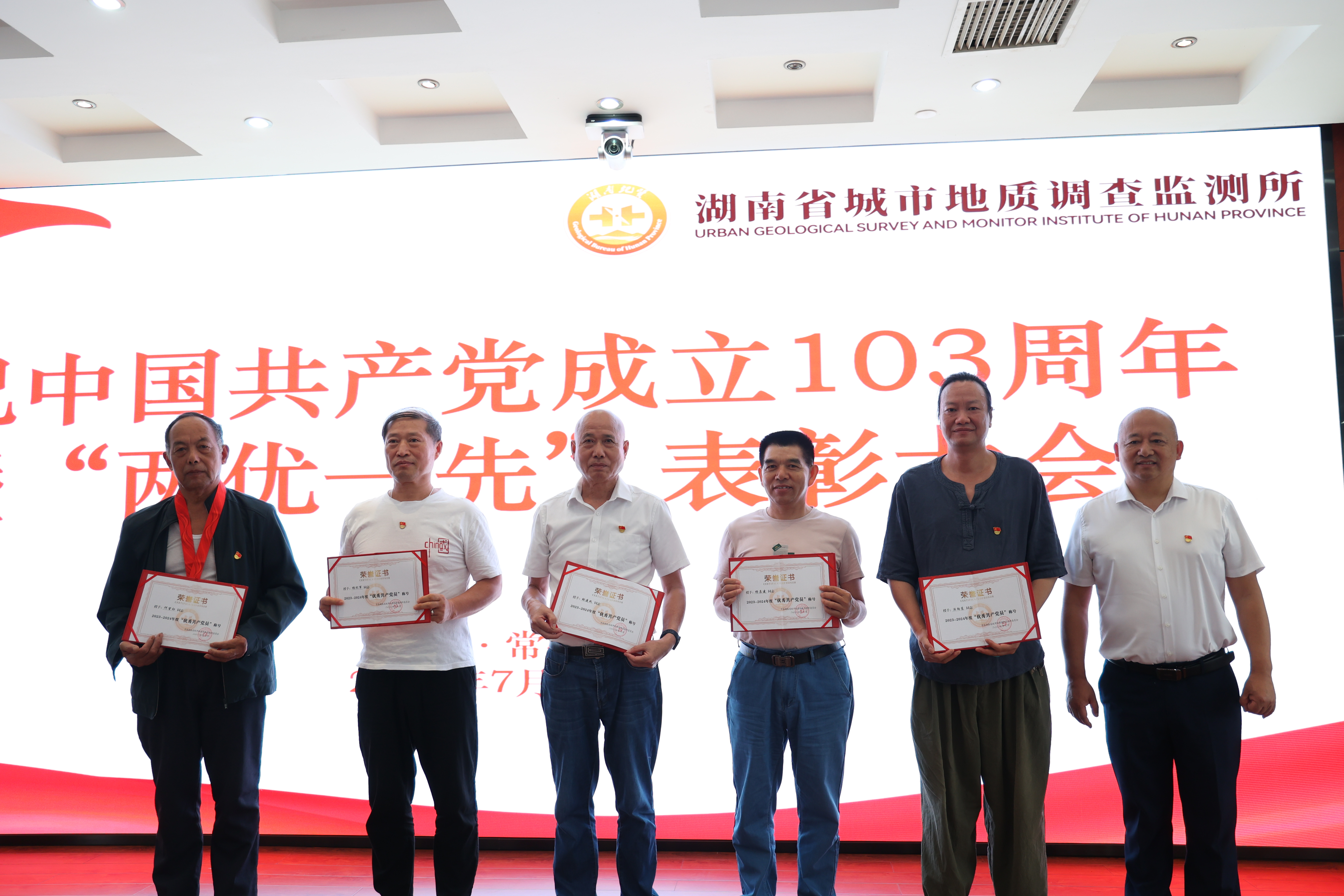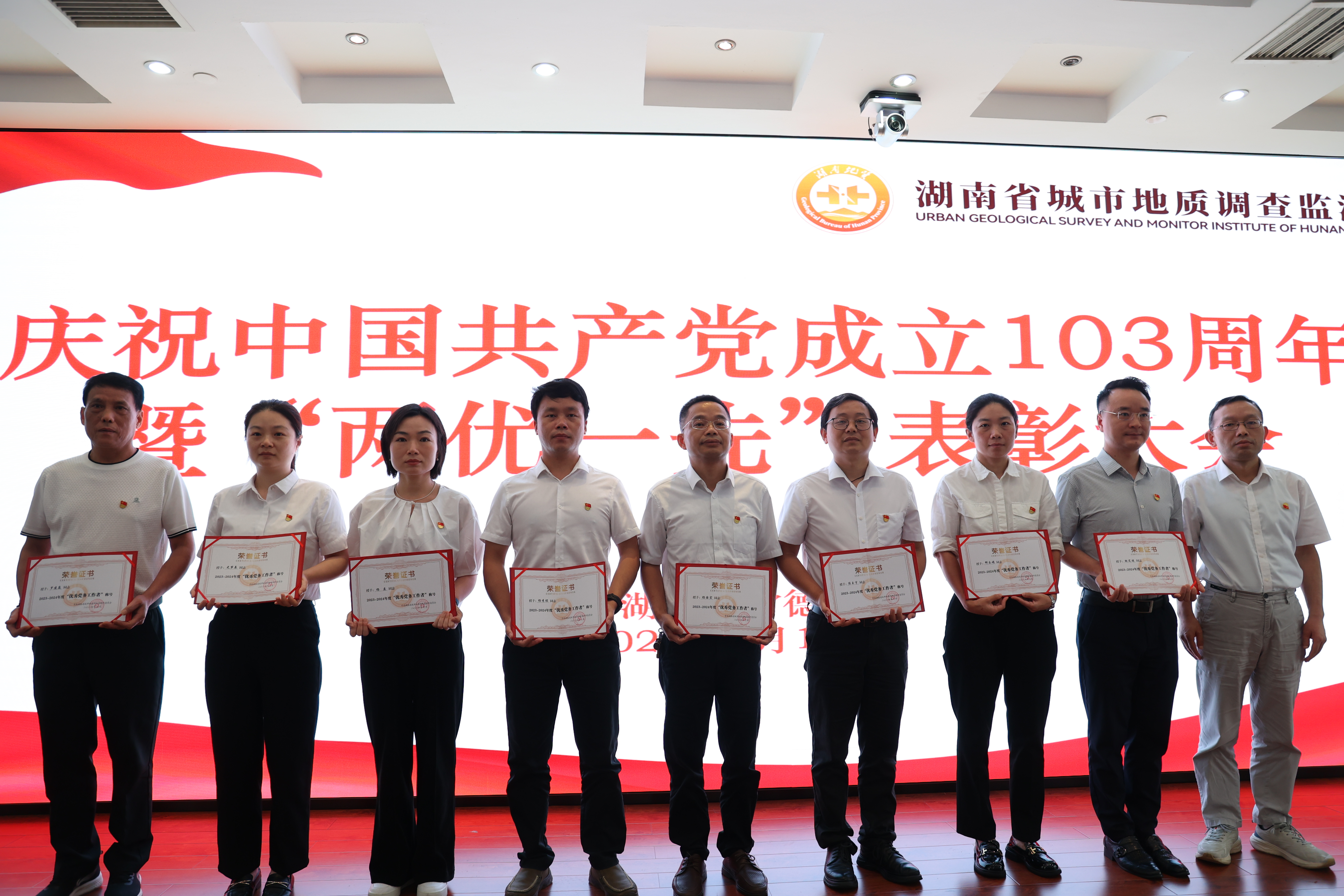百年征程波澜壮阔,百年初心历久弥坚。为隆重庆祝中国共产党成立103周年,营造庆“七一”、颂党恩、跟党走的浓厚氛围。7月1日,省城调所在常德基地十楼大会议室举办庆祝中国共产党成立103周年“七·一”系列活动,表彰省城调所2023-2024年度先进党支部、优秀共产党员和优秀党务工作者,为“光荣在党50年”老党员颁发纪念章,并举办“赓续地质精神 传承清廉家风”演讲比赛。党委书记张健、在家领导班子成员出席活动。
