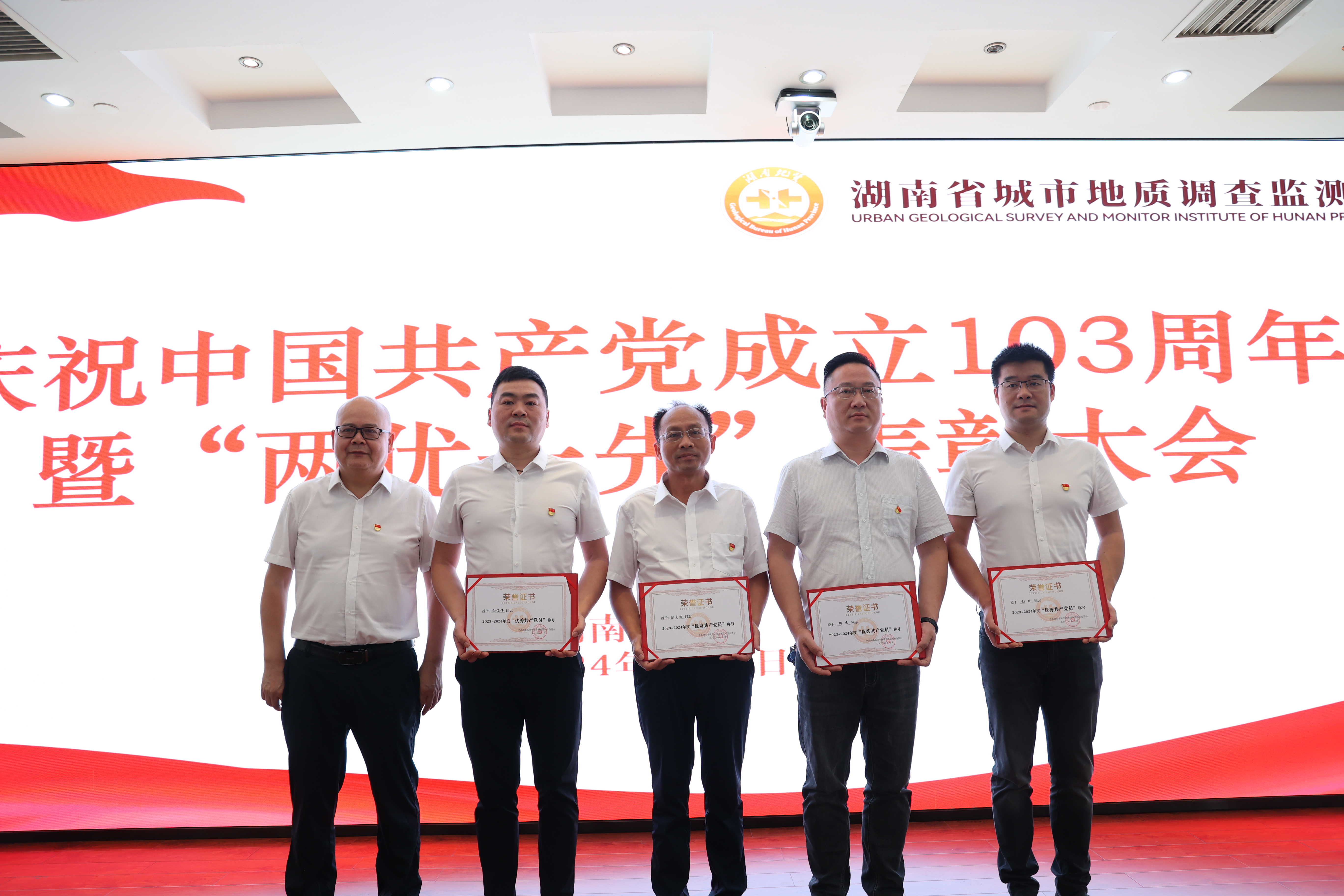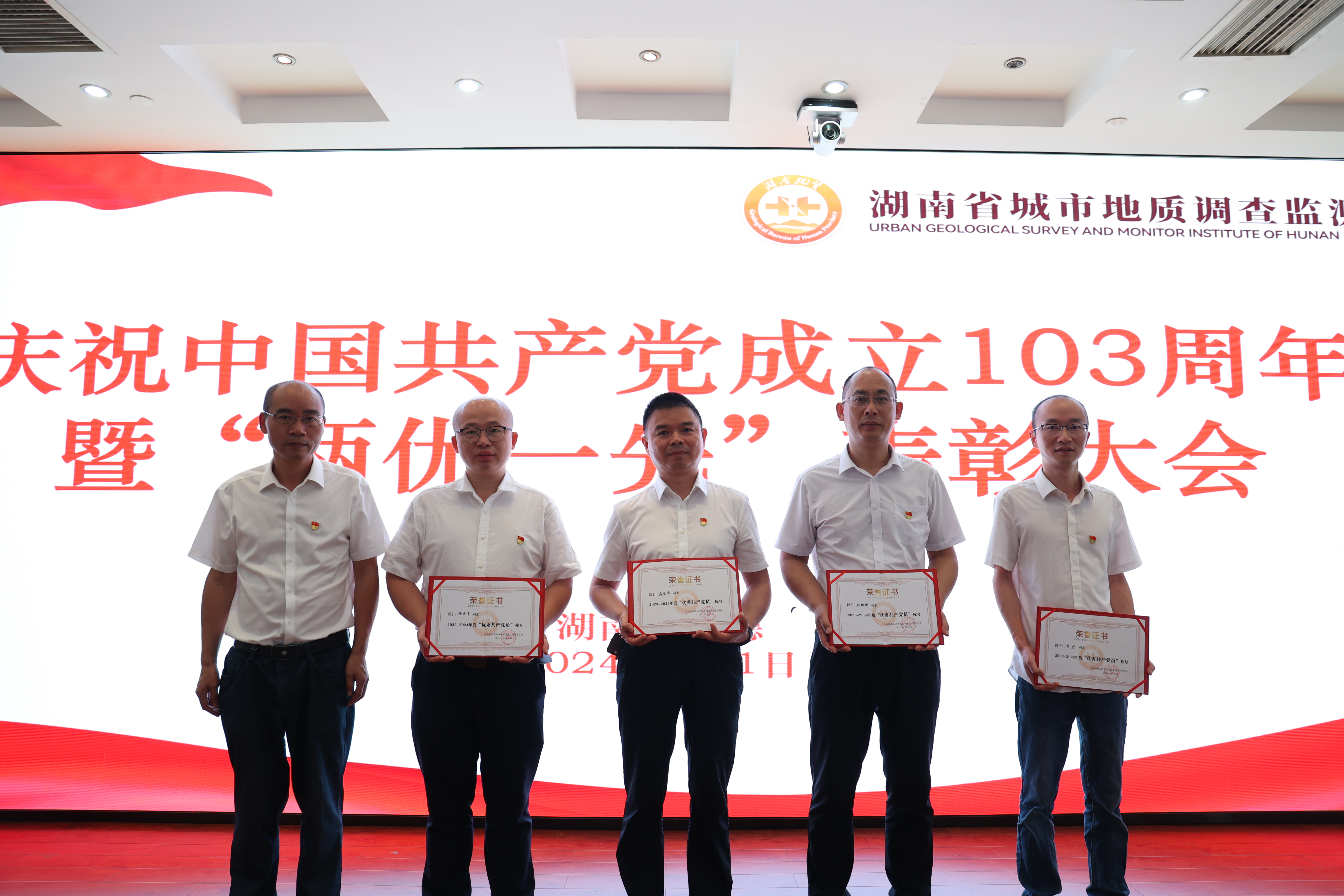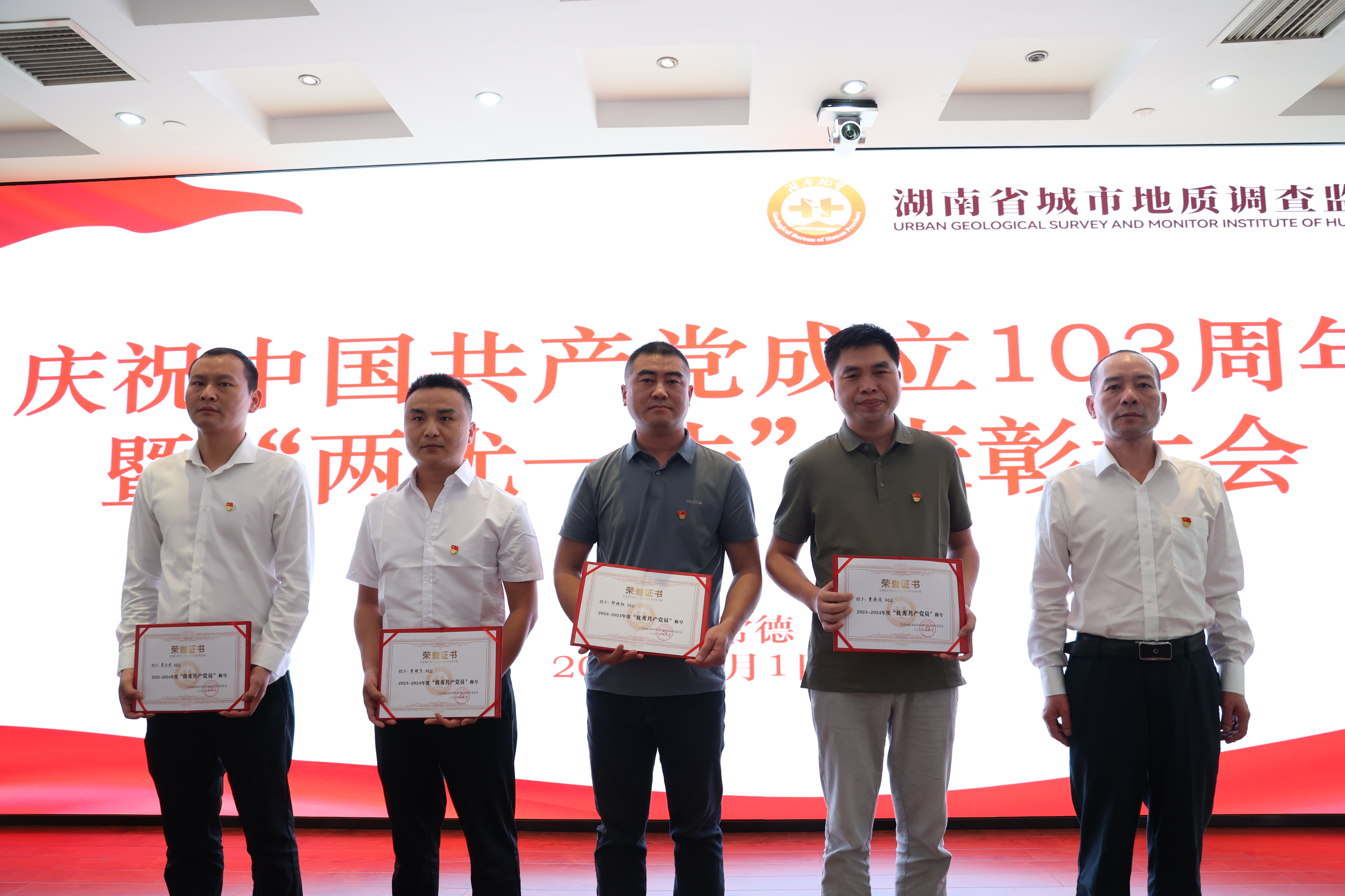 百年征程波澜壮阔,百年初心历久弥坚。为隆重庆祝中国共产党成立103周年,营造庆“七一”、颂党恩、跟党走的浓厚氛围。7月1日,省城调所在常德基地十楼大会议室举办庆祝中国共产党成立103周年“七·一”系列活动,表彰省城调所2023-2024年度先进党支部、优秀共产党员和优秀党务工作者,为“光荣在党50年”老党员颁发纪念章,并举办“赓续地质精神 传承清廉家风”演讲比赛。党委书记张健、在家领导班子成员出席活动。