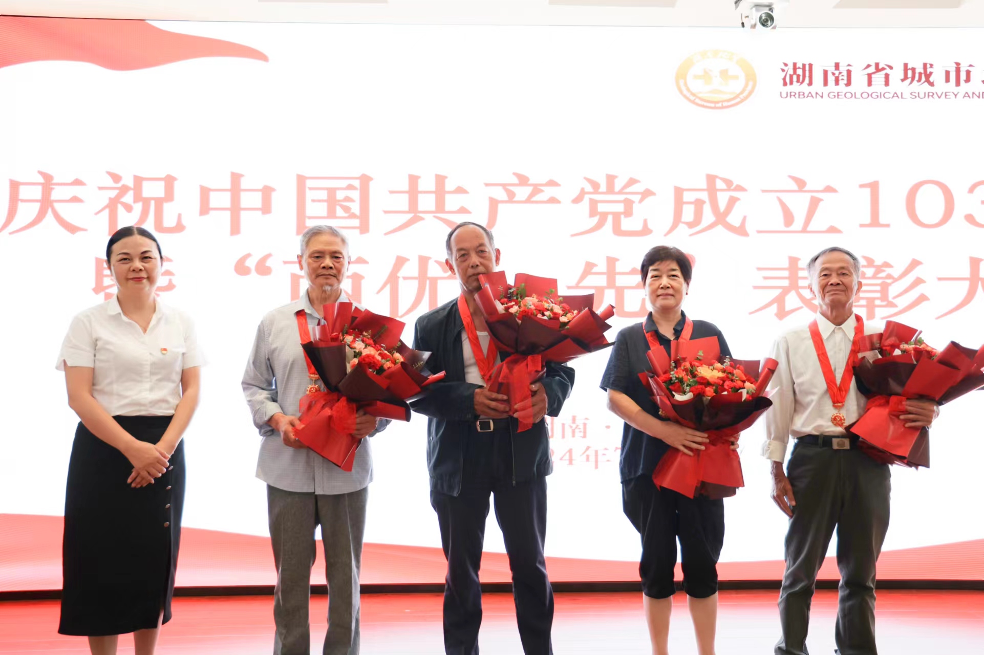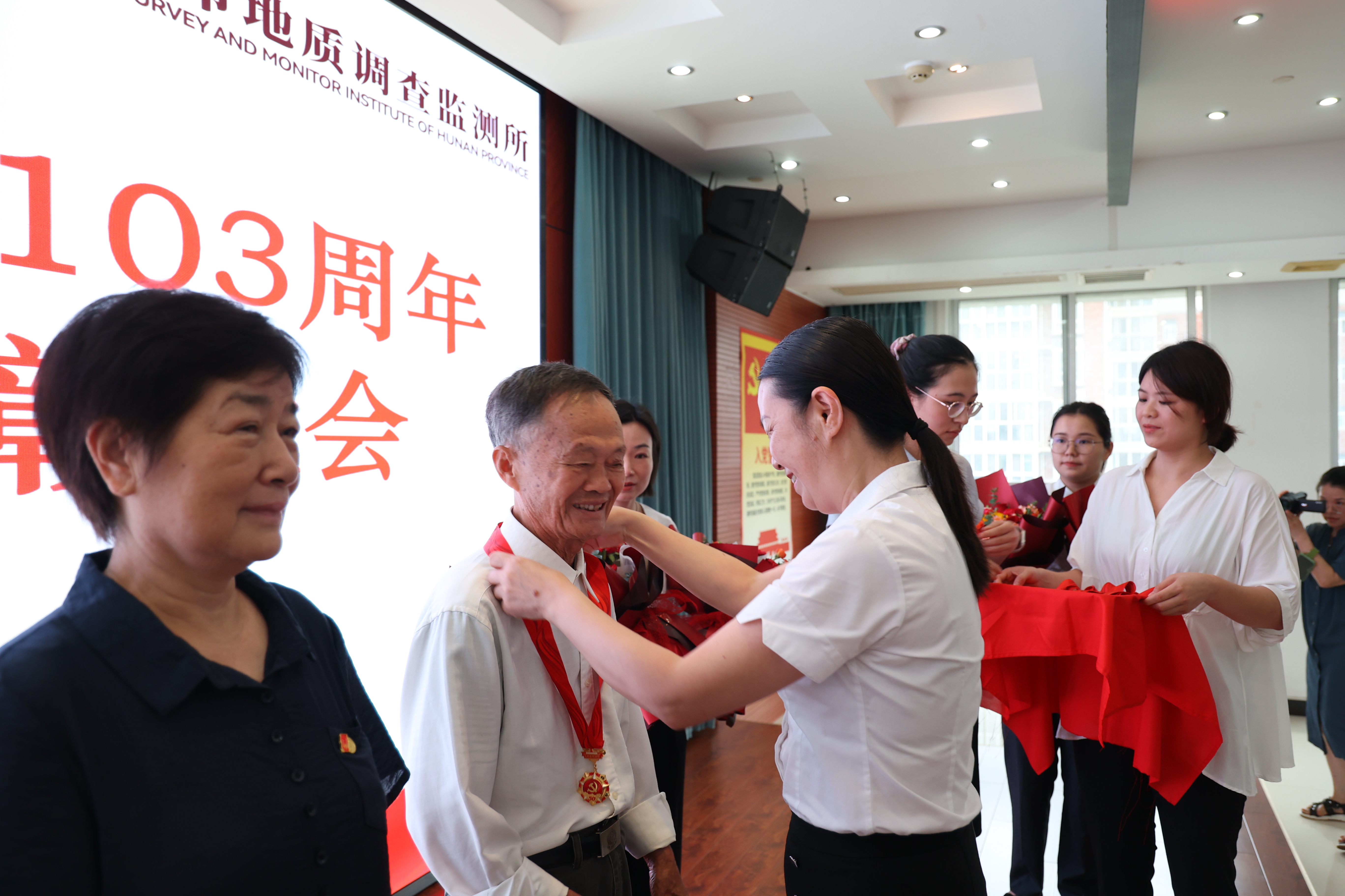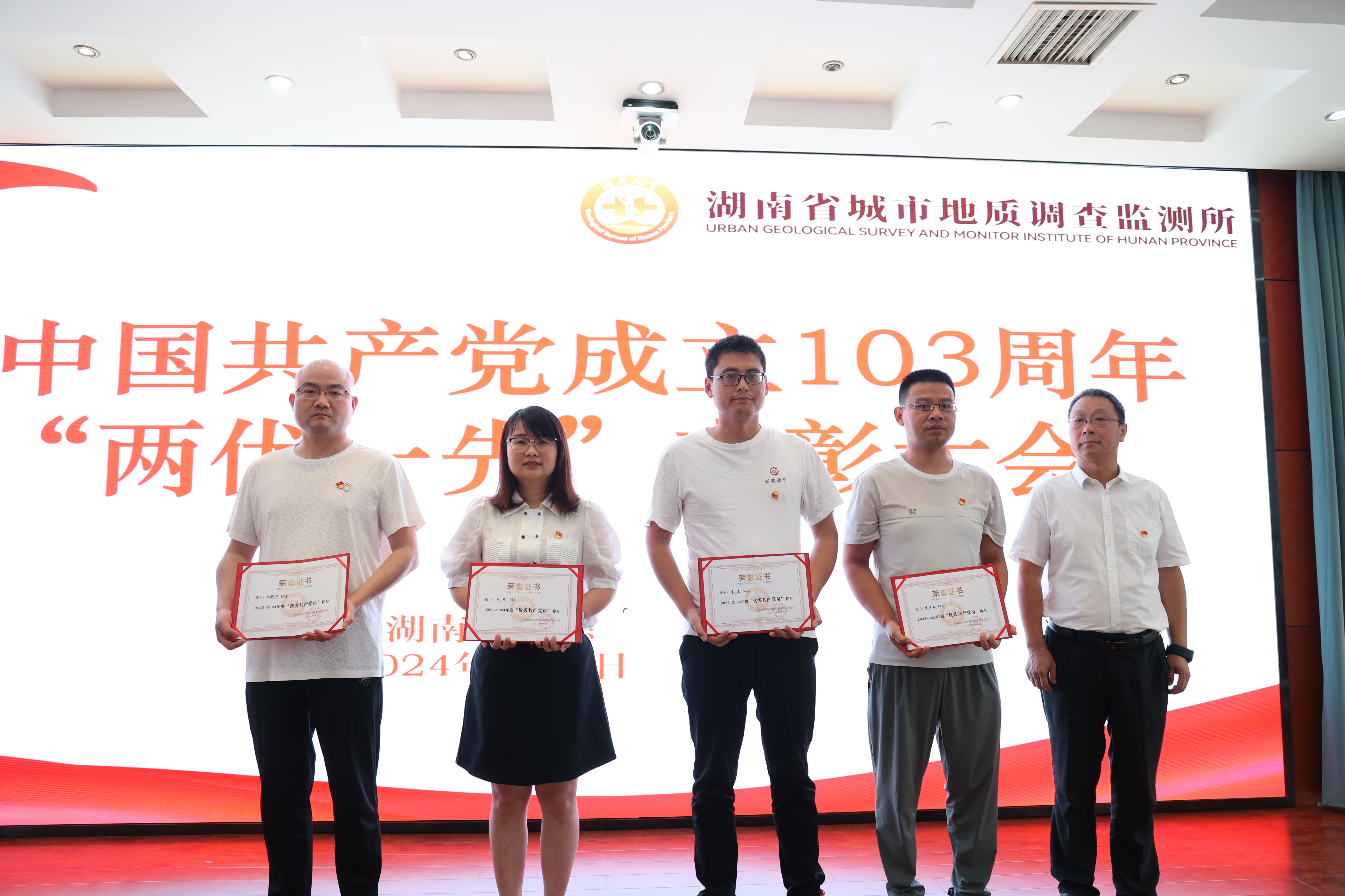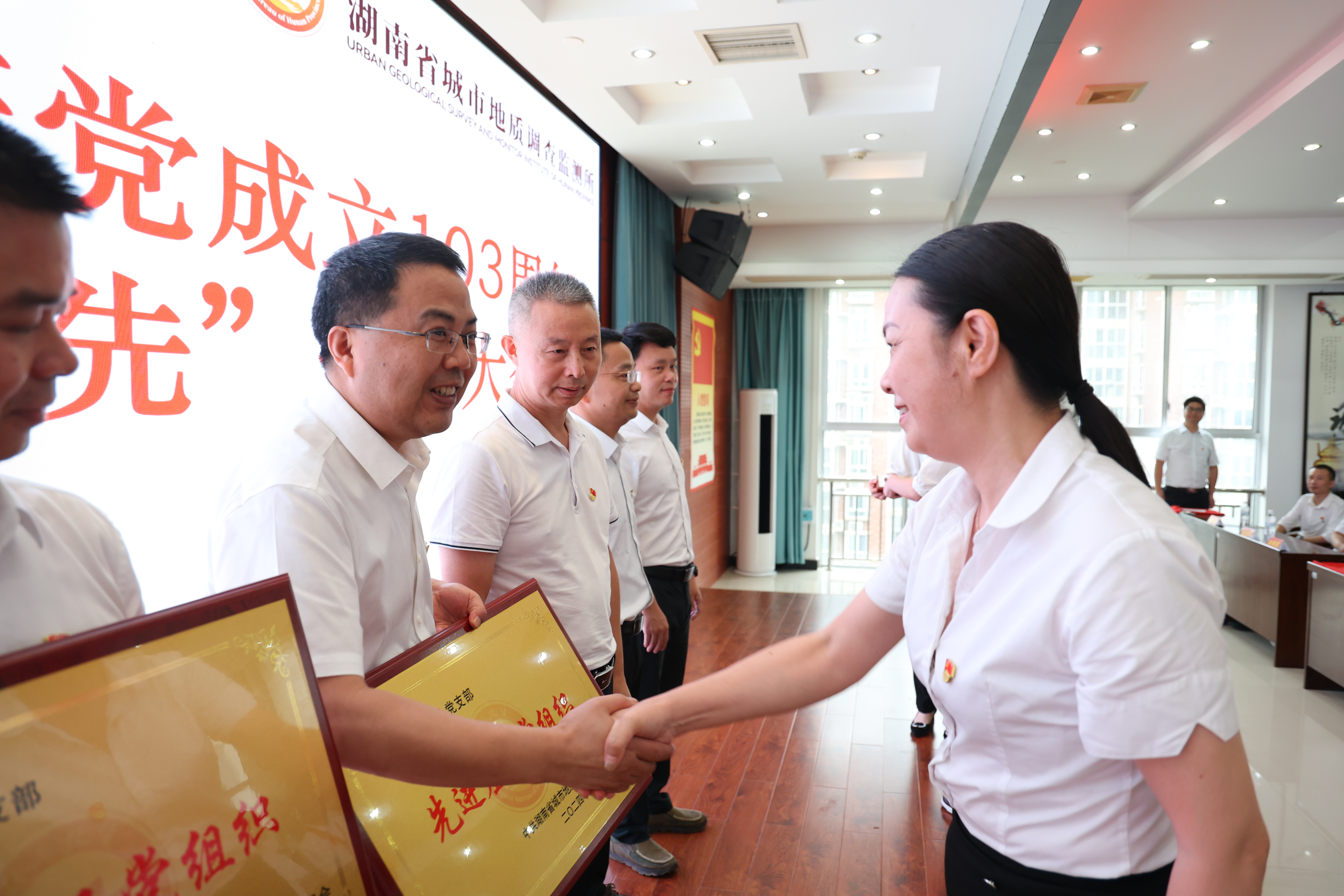 百年征程波澜壮阔,百年初心历久弥坚。为隆重庆祝中国共产党成立103周年,营造庆“七一”、颂党恩、跟党走的浓厚氛围。7月1日,省城调所在常德基地十楼大会议室举办庆祝中国共产党成立103周年“七·一”系列活动,表彰省城调所2023-2024年度先进党支部、优秀共产党员和优秀党务工作者,为“光荣在党50年”老党员颁发纪念章,并举办“赓续地质精神 传承清廉家风”演讲比赛。党委书记张健、在家领导班子成员出席活动。