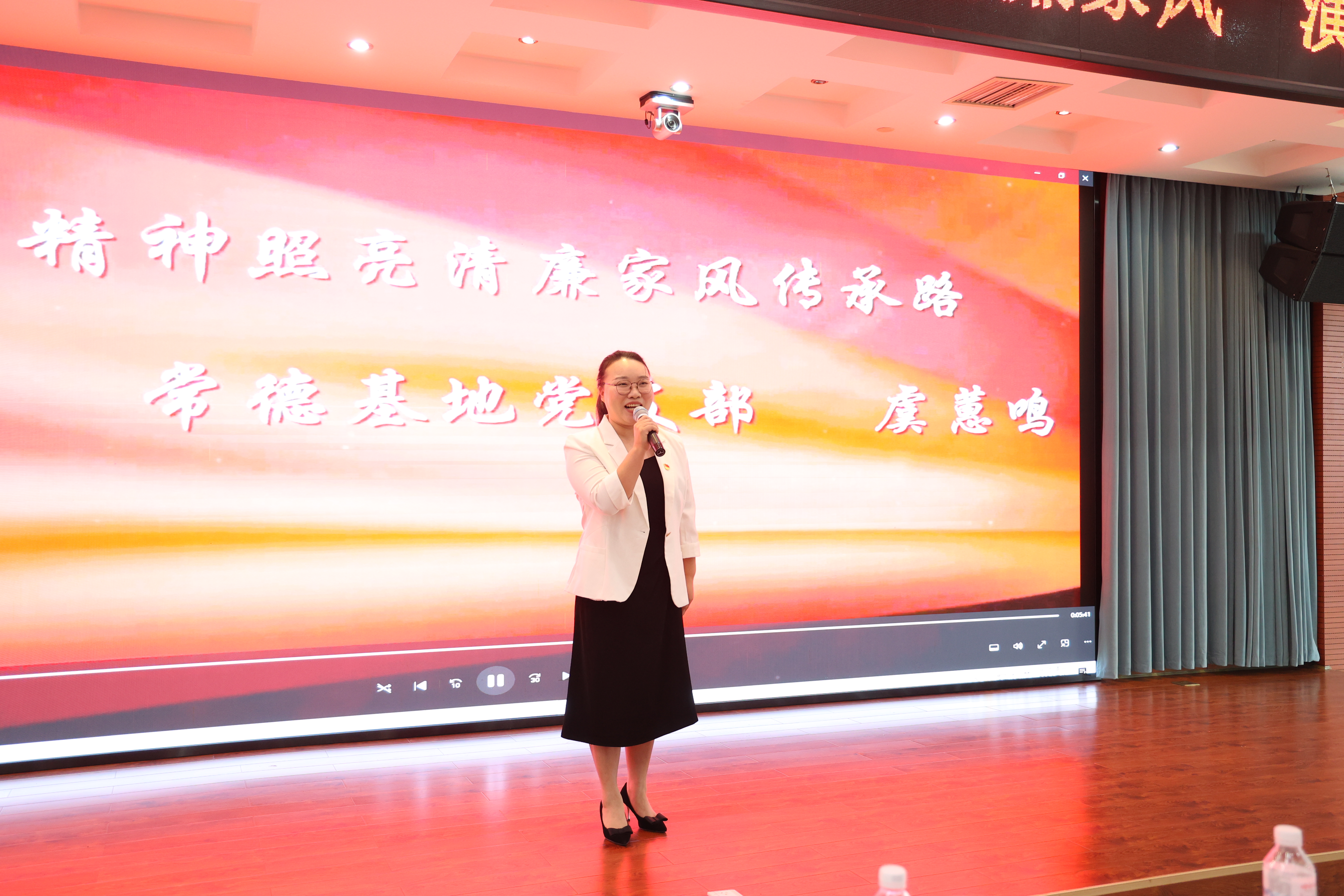 常德基地党支部选手虞蕙鸣首先登场,她以《让地质精神照亮清廉家风传承路》为题,充满激情的表演瞬间让大家感受到朗诵的专业水准和舞台魅力,赢得满堂喝彩!