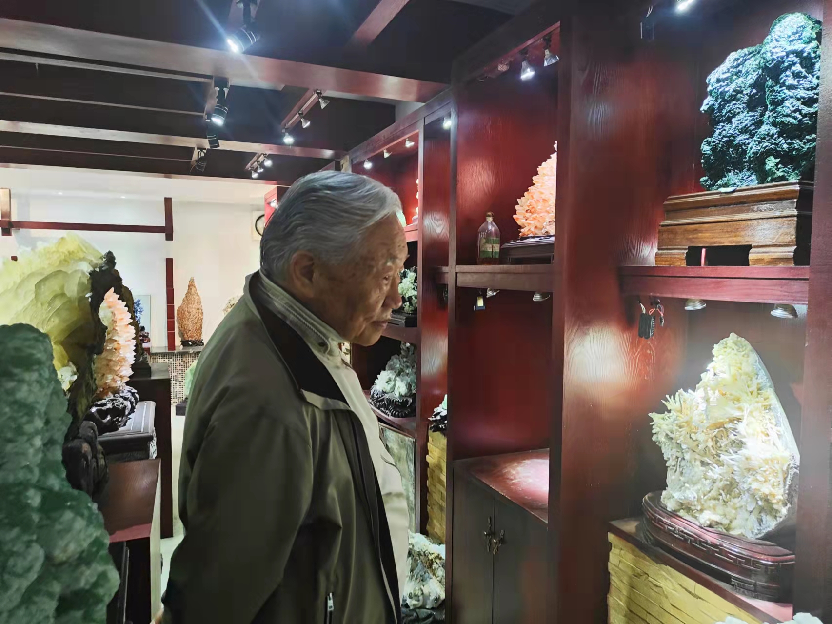 在测试中心珠宝市场,宋瑞祥走访了市场内多家商铺,亲切关怀店铺经营情况,认真查看宝玉石、岩矿石标本,不时在标本前驻足,仔细端详研究,并详细给大家讲解岩矿石标本的相关知识。调研过程中,宋部长深情回顾了自己在地矿系统的工作经历,肯定了测试中心在改革转型过程中取得的成果。他指出,测试中心要加快工作思想上的转变,适应新时代社会经济发展需求,建议测试中心进一步深化珠宝市场的提质改造工作,争取将珠宝市场市场打造成高水平高规格的特色项目。